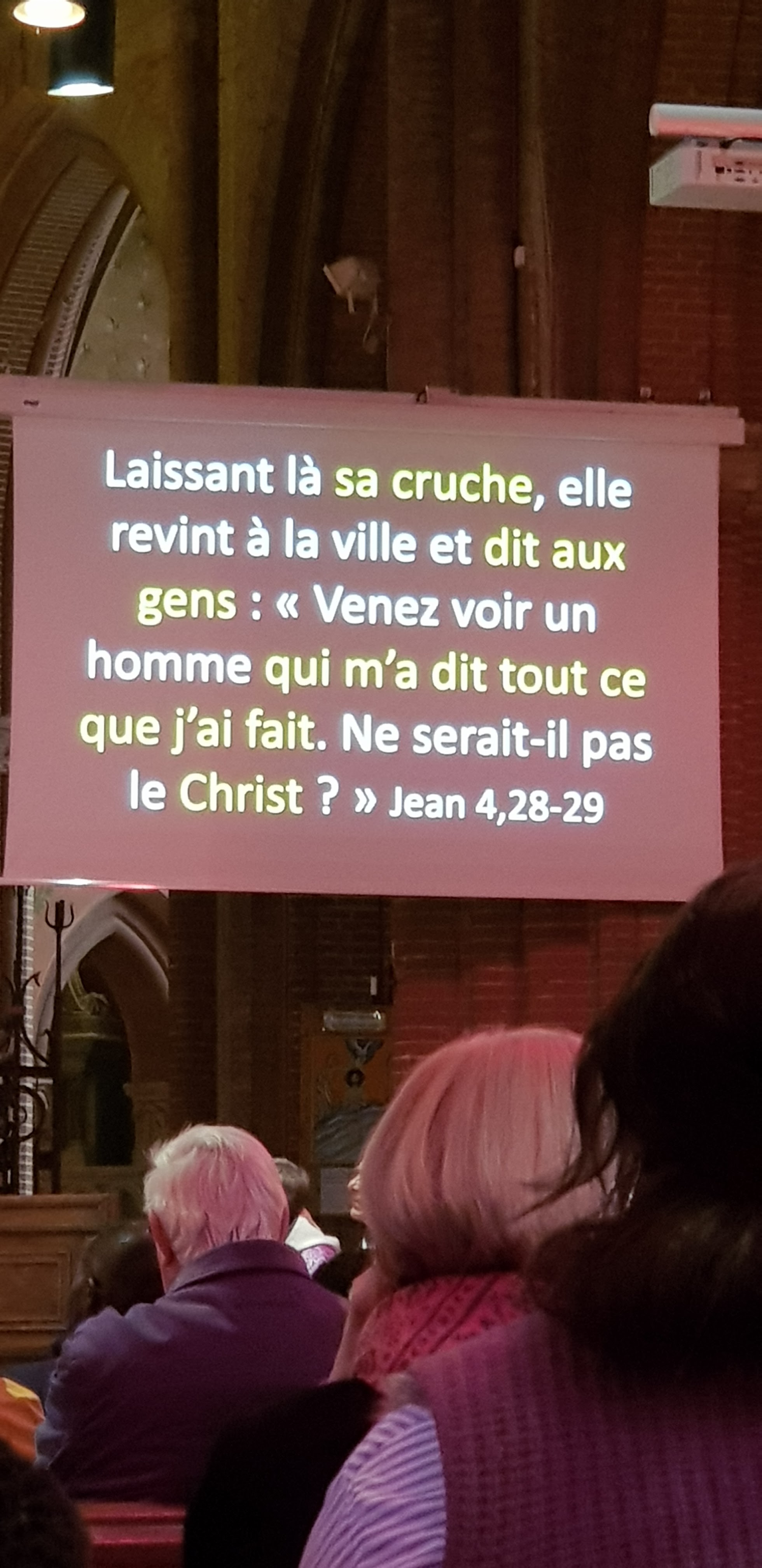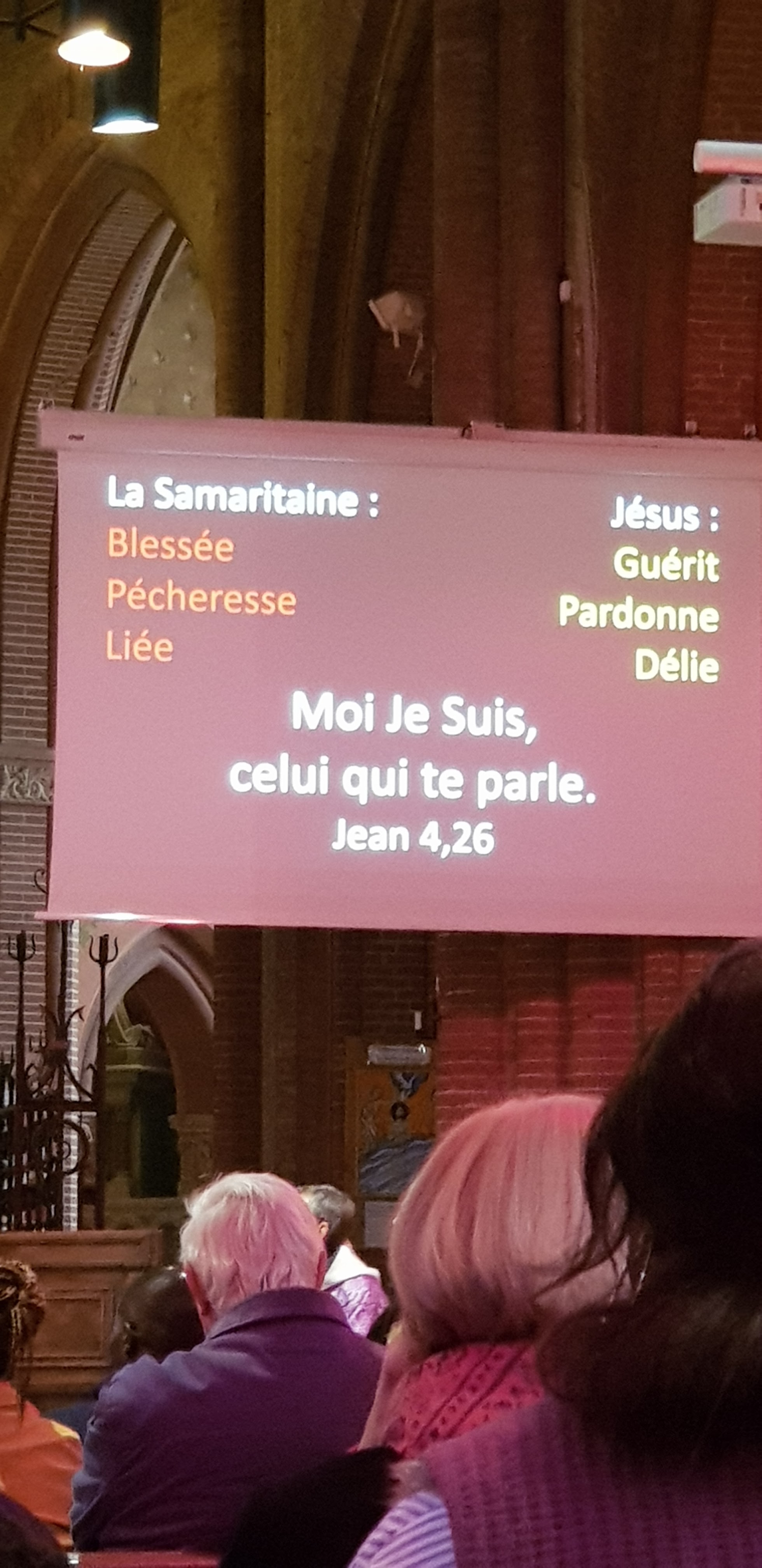 Belle paroisse, les gens que l'on rencontre sont très gentils et accueillants, j'adore le mien le dimanche à 10h30 car ils projettent les chants, les psaumes sur des écrans et le curé les utilise aussi lorsqu'il donne le sermon. Je parle peu français et pour moi c'est très pédagogique, car quand je le lis je comprends mieux Le Message. Hier était un jour spécial car j'ai eu une très belle cérémonie, où ils ont donné une bénédiction spéciale au couple qui a terminé sa préparation au mariage, cela m'a rempli de joie.