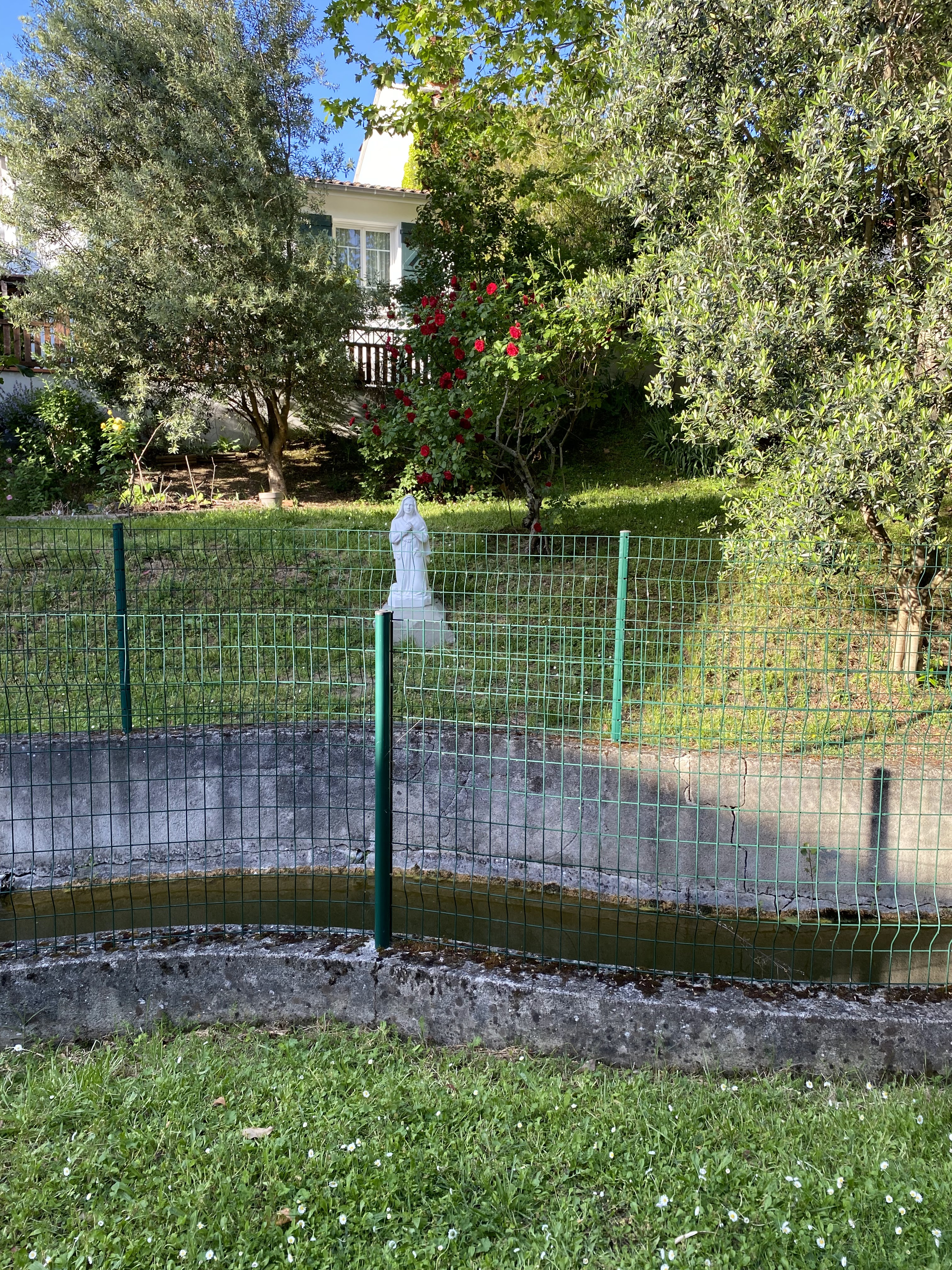 Joli jardin avec mini grotte et très belle église .