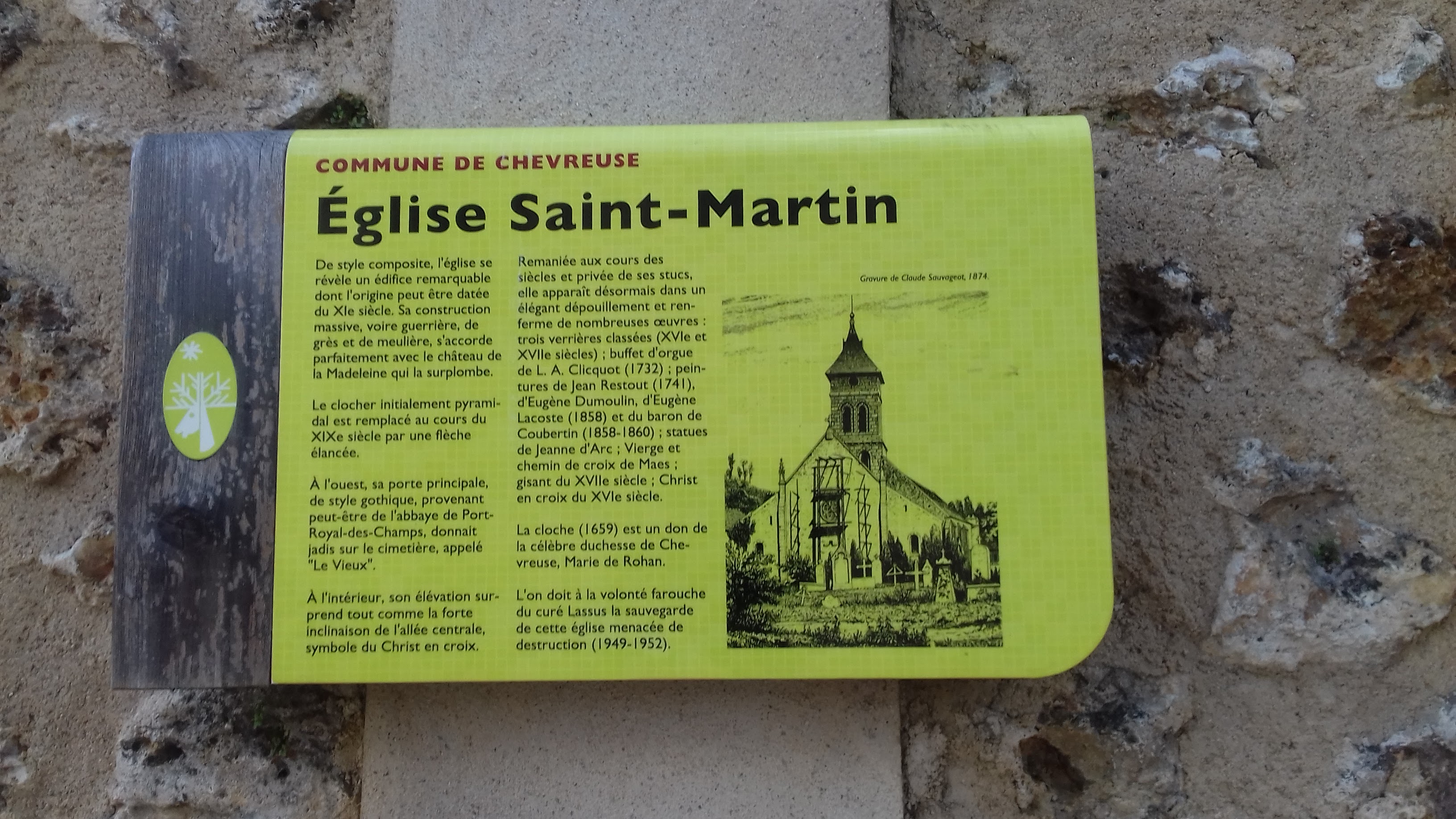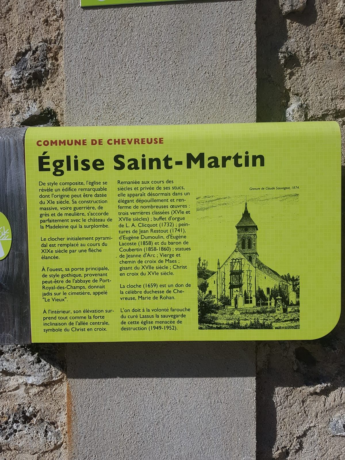 De par son style composite, l'église paroissiale Saint-Martin de Chevreuse se révèle un édifice remarquable à plus d'un titre. Son origine dans les parties les plus anciennes (tour du clocher) peut être datée du XIe siècle. De construction massive, trapue voire guerrière, faite de grès et de meulière, son esthétique s'accorde parfaitement avec le château de la Madeleine qui la surplombe. Le clocher initialement pyramidal fut remplacé au cours du XIXe siècle par une flèche élancée. Sa porte principale de style gothique, à l'ouest, provenant peut-être de l'abbaye de Port-Royal-des-Champs, donnait jadis sur le cimetière dit le Vieux. À l'intérieur, son élévation surprend tout comme la forte inclinaison de l'allée centrale qui pourrait symboliser le Christ en croix. Sans cesse remaniée au cours des siècles, c'est dépouillée de ses stucs que l'église apparaît désormais. Sur le chevet est, trois verrières classées (XVIe et XVIIe siècles) dispensent selon les heures du jour une belle lumière qui met en valeur la pierre de meulière. A découvrir avec humilité et curiosité.