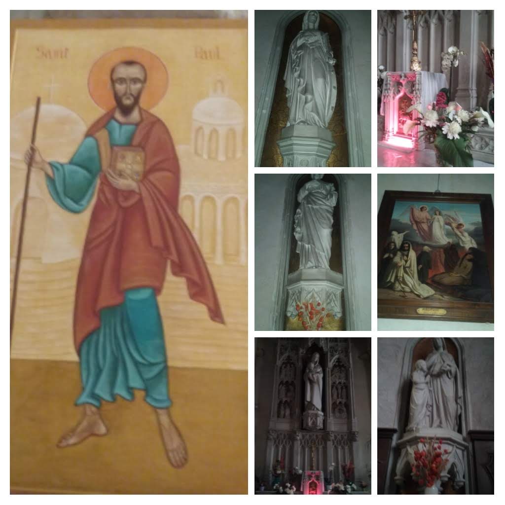 Église modeste mais avec un chemin de croix personnalisé. Des vitraux et statues fabuleux