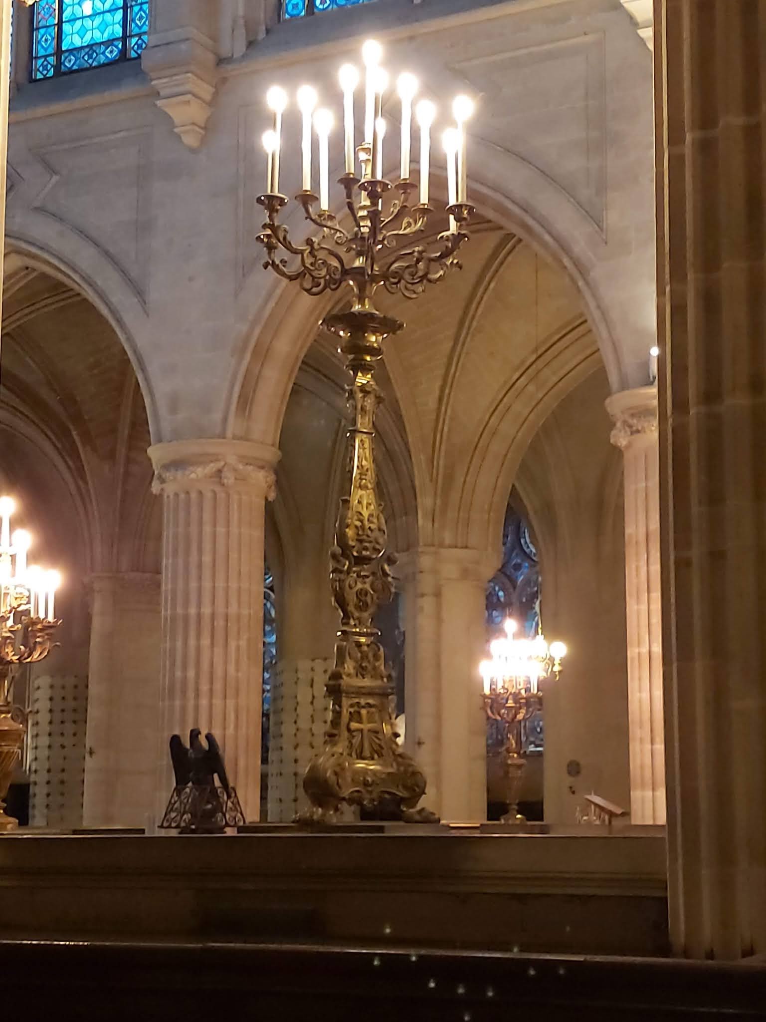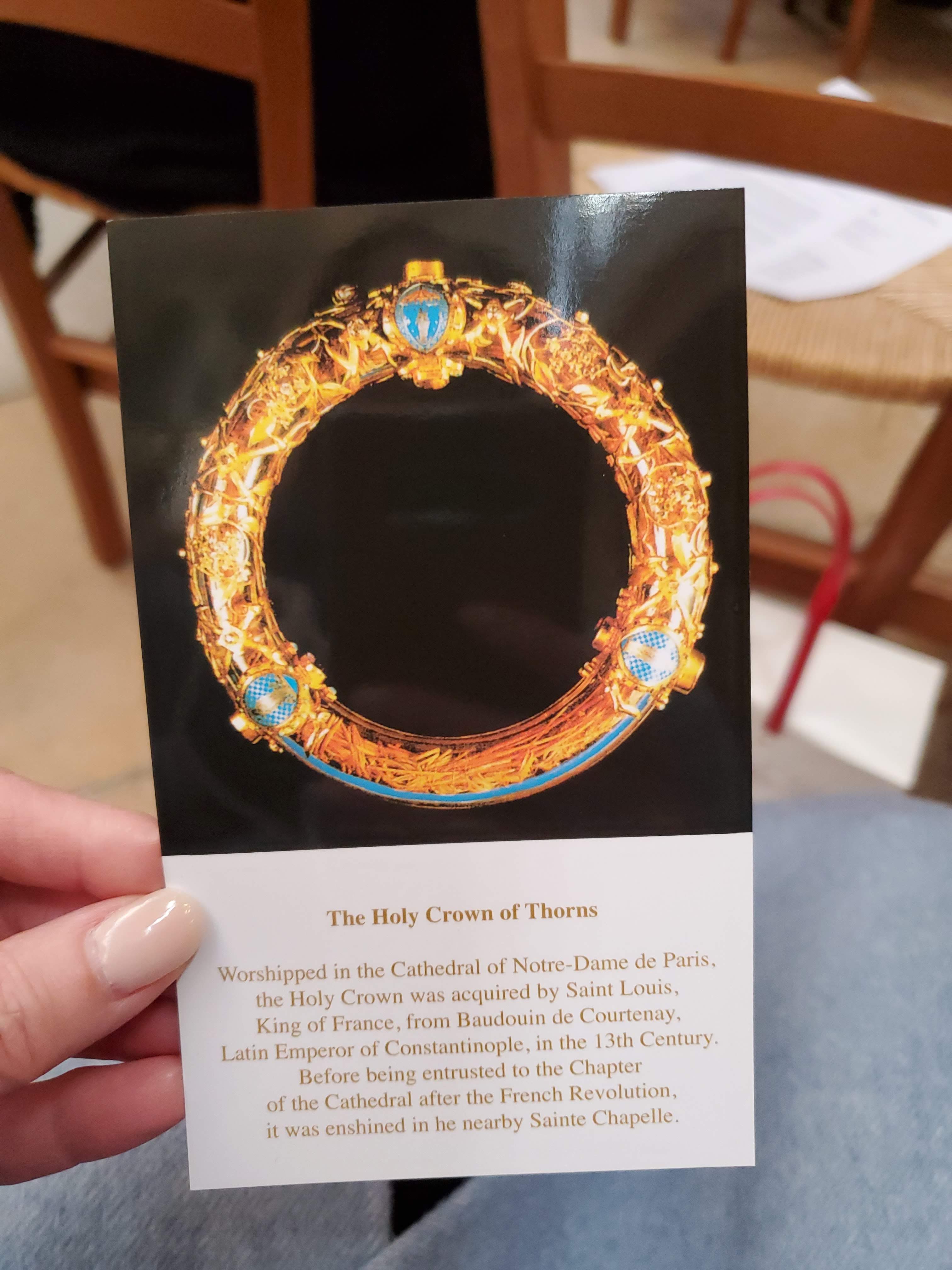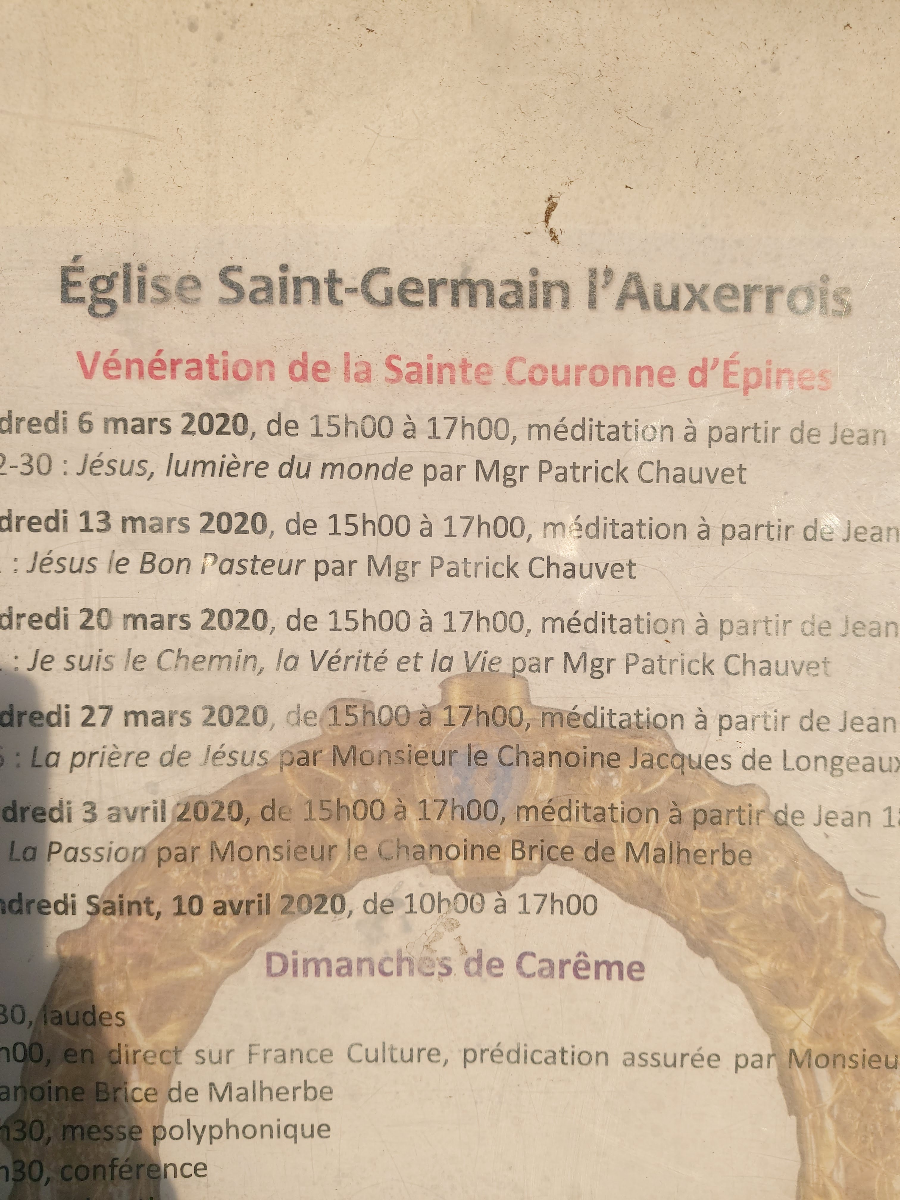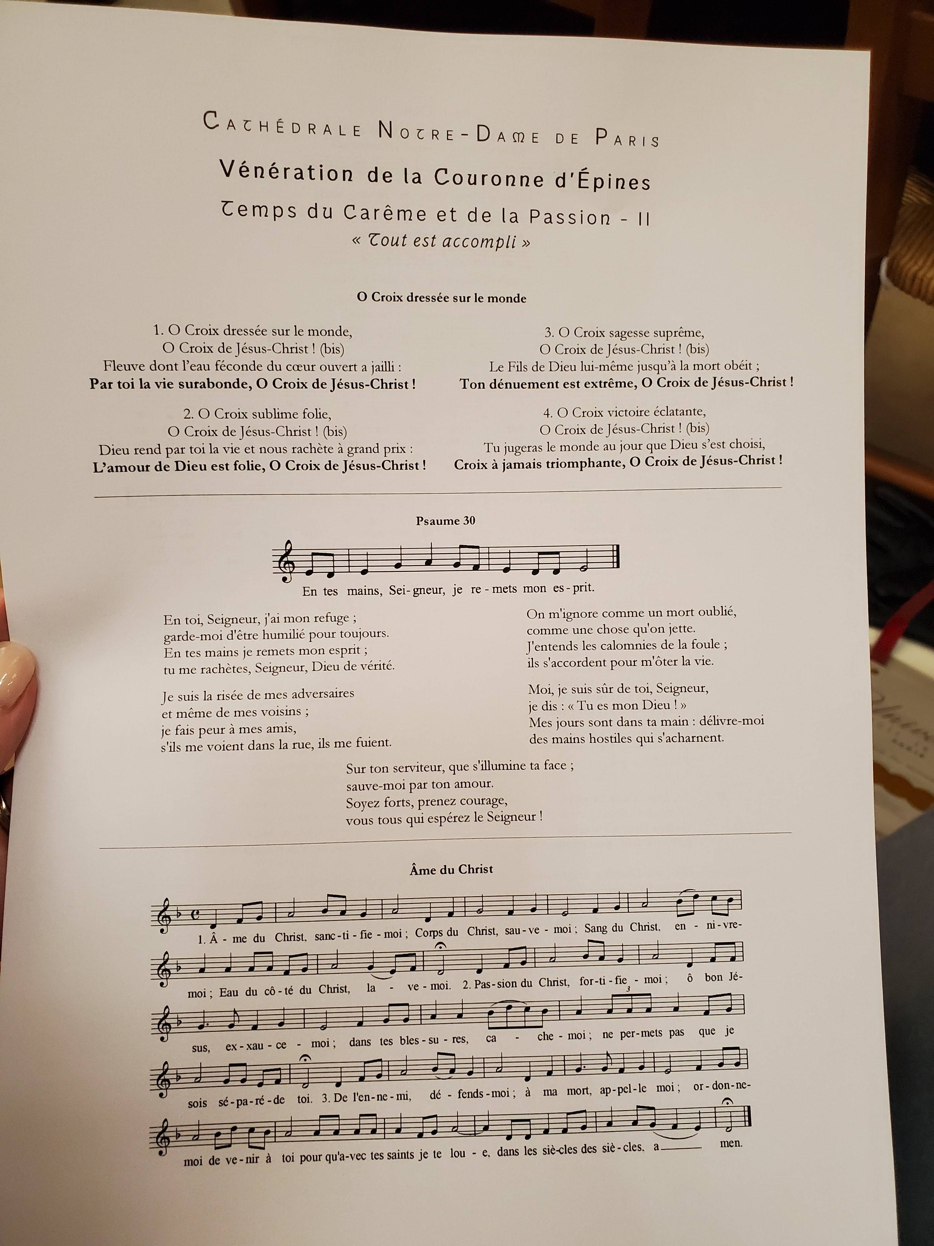 On a assisté à la vénération de la Couronne d'Épines un vendredi du temps du Carême. L'évèque de Notre Dame et son paroisse sont y acceuilli pendant que le cathédrale se renouvèle (à cause de l'incendie). L'église et la culte nous ont émoué. Merci de nous a acceuilli des États-Unis et que Dieu vous bénisse. *** We attended the veneration of the Crown of Thorns on a Friday during Lent. The bishop of Notre Dame and his parish are welcomed there while the cathedral is being renovated (because of the fire). The church and the worship moved us. Thank you for welcoming us from the United States and God bless you.