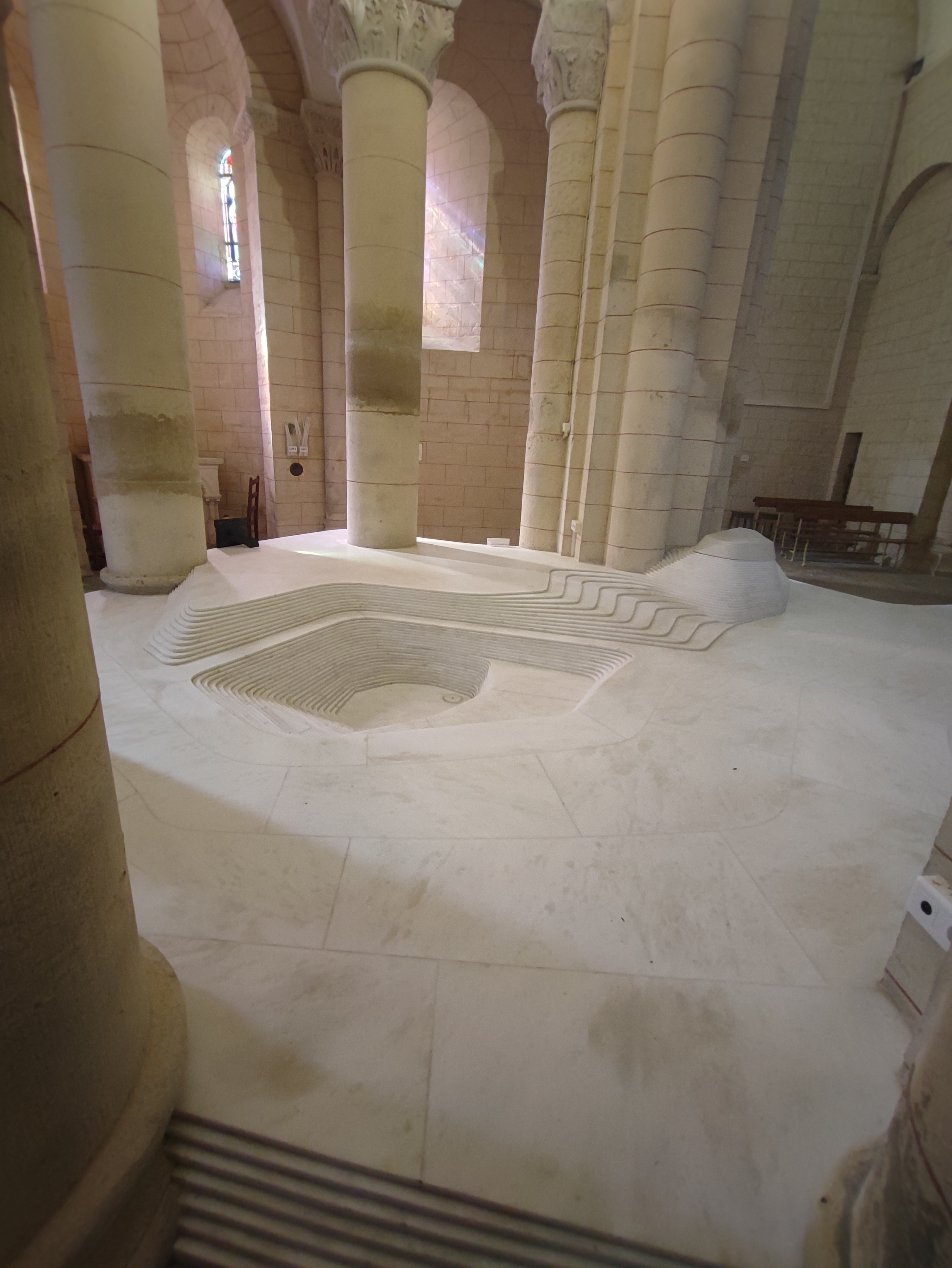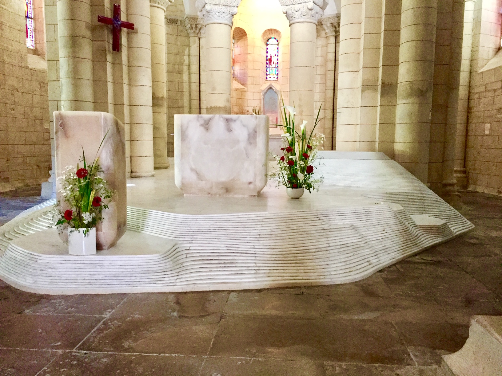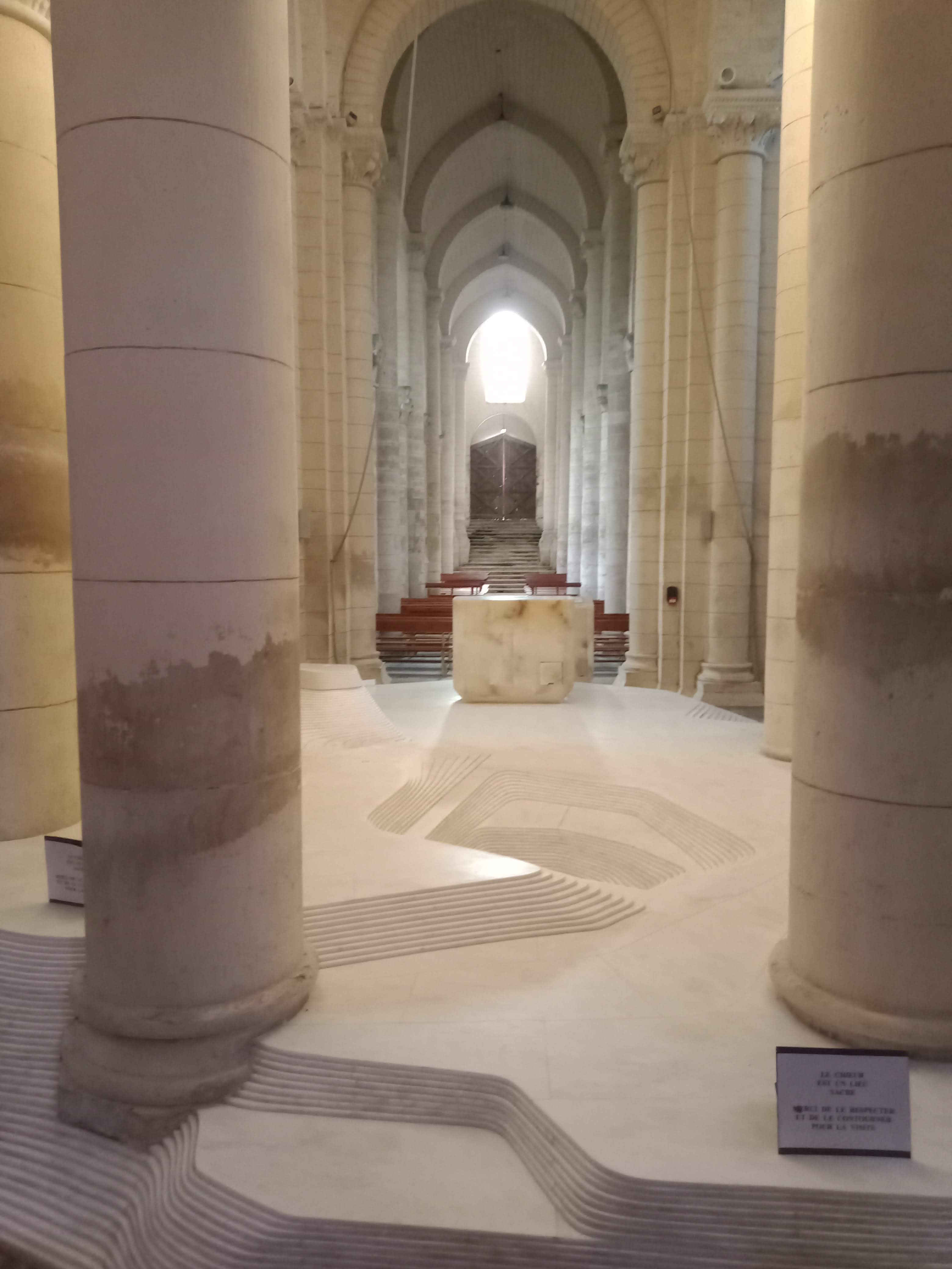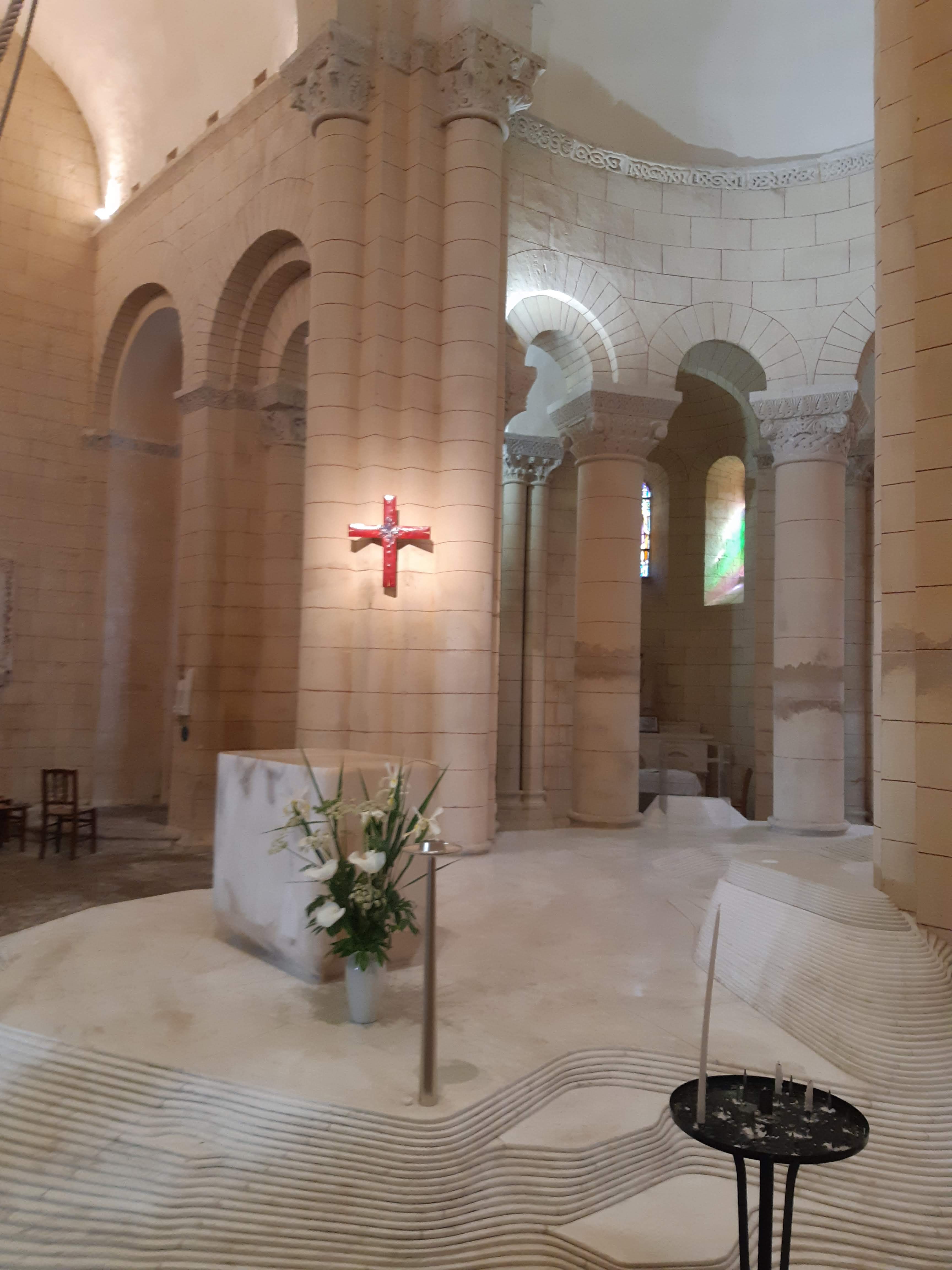 C'est une splendeur de l'art roman, posée là en bord de route. Sous un rayon de soleil elle paraît vite d'une blancheur immaculée. On doit reconnaître que l'autel de Mathieu Lehanneur s'est parfaitement intégrée dans l'ouvrage malgré les siècles qui le séparent de l’œuvre des tailleurs de pierre du 12ème siècle.
