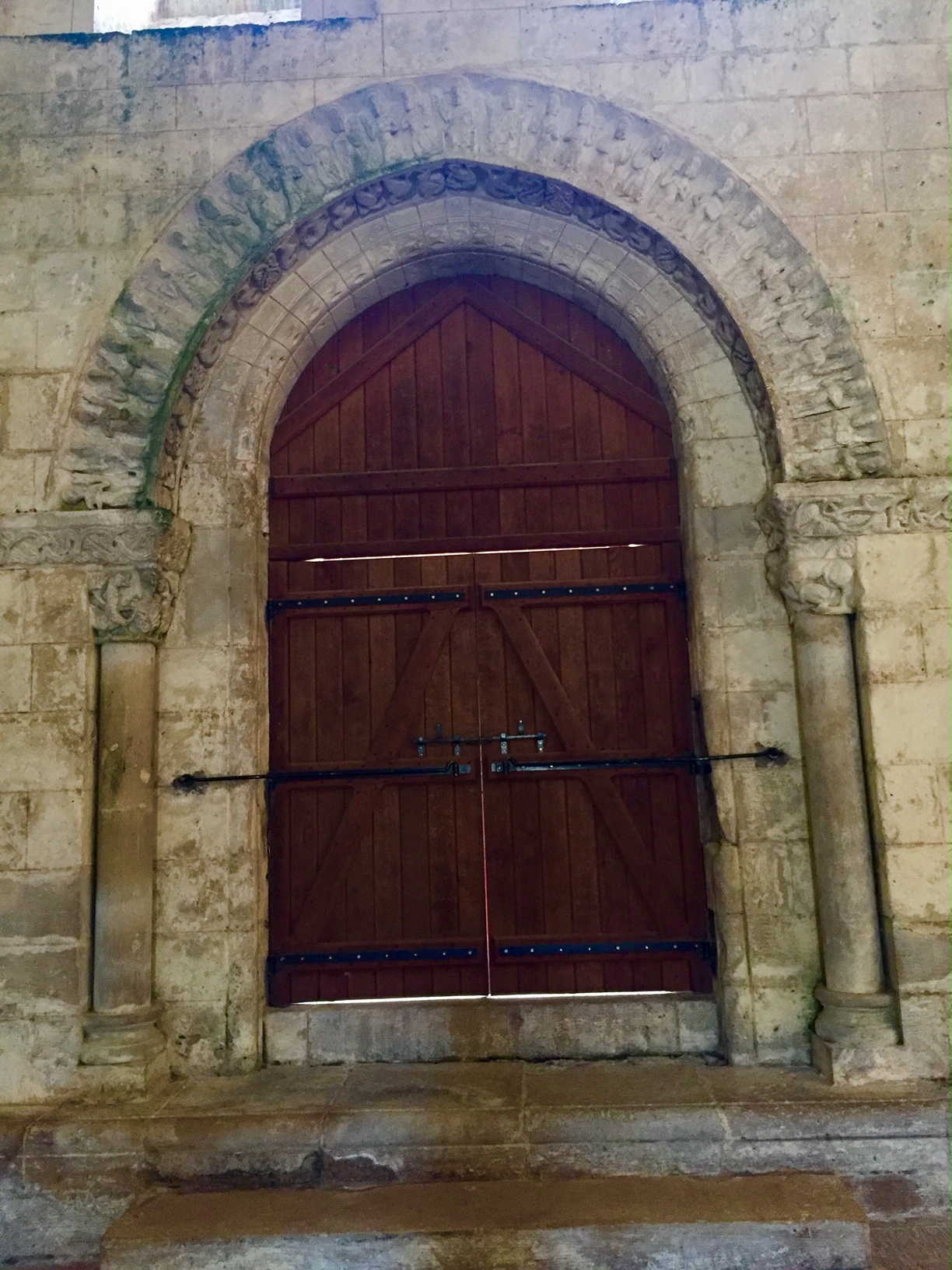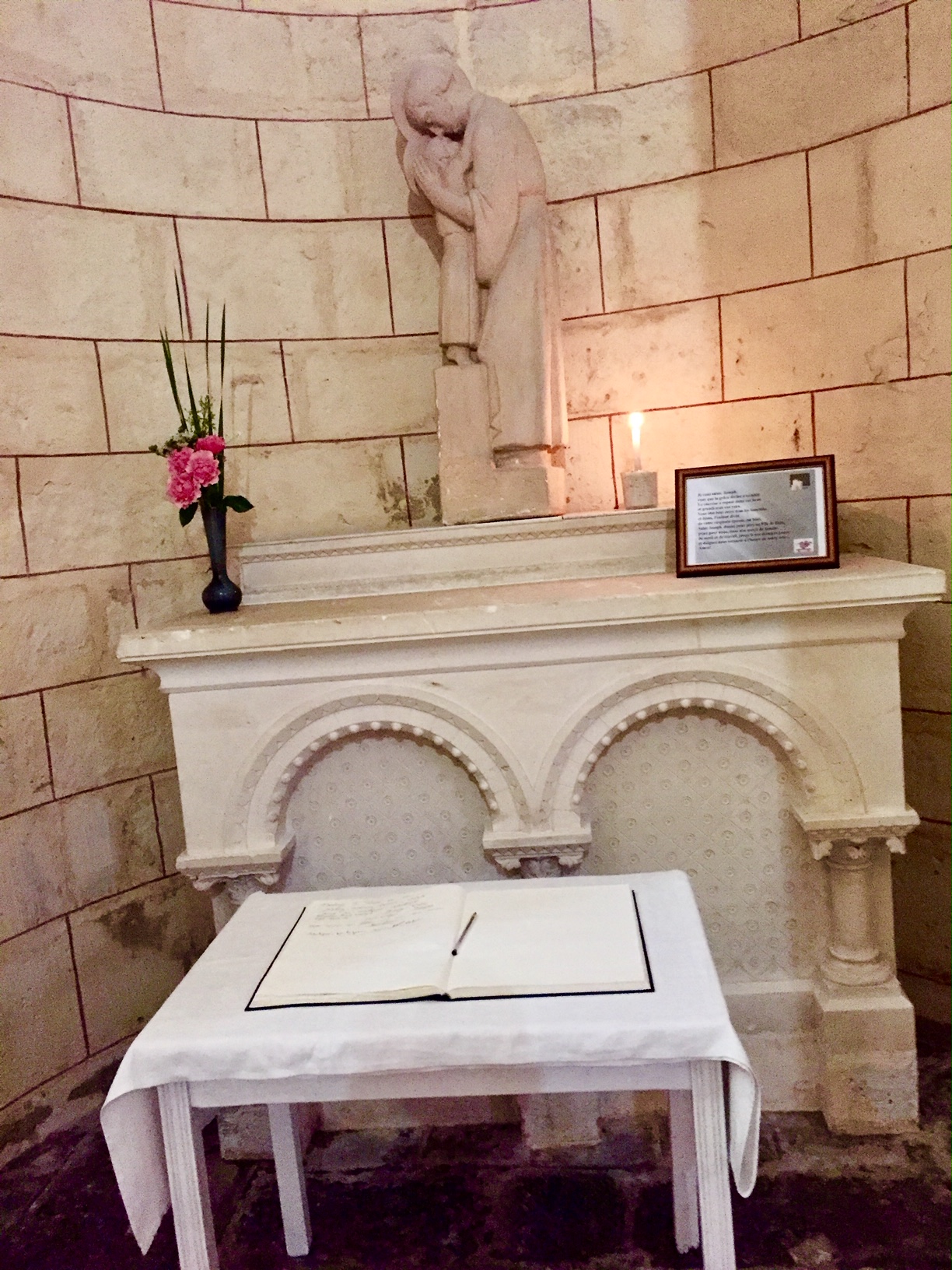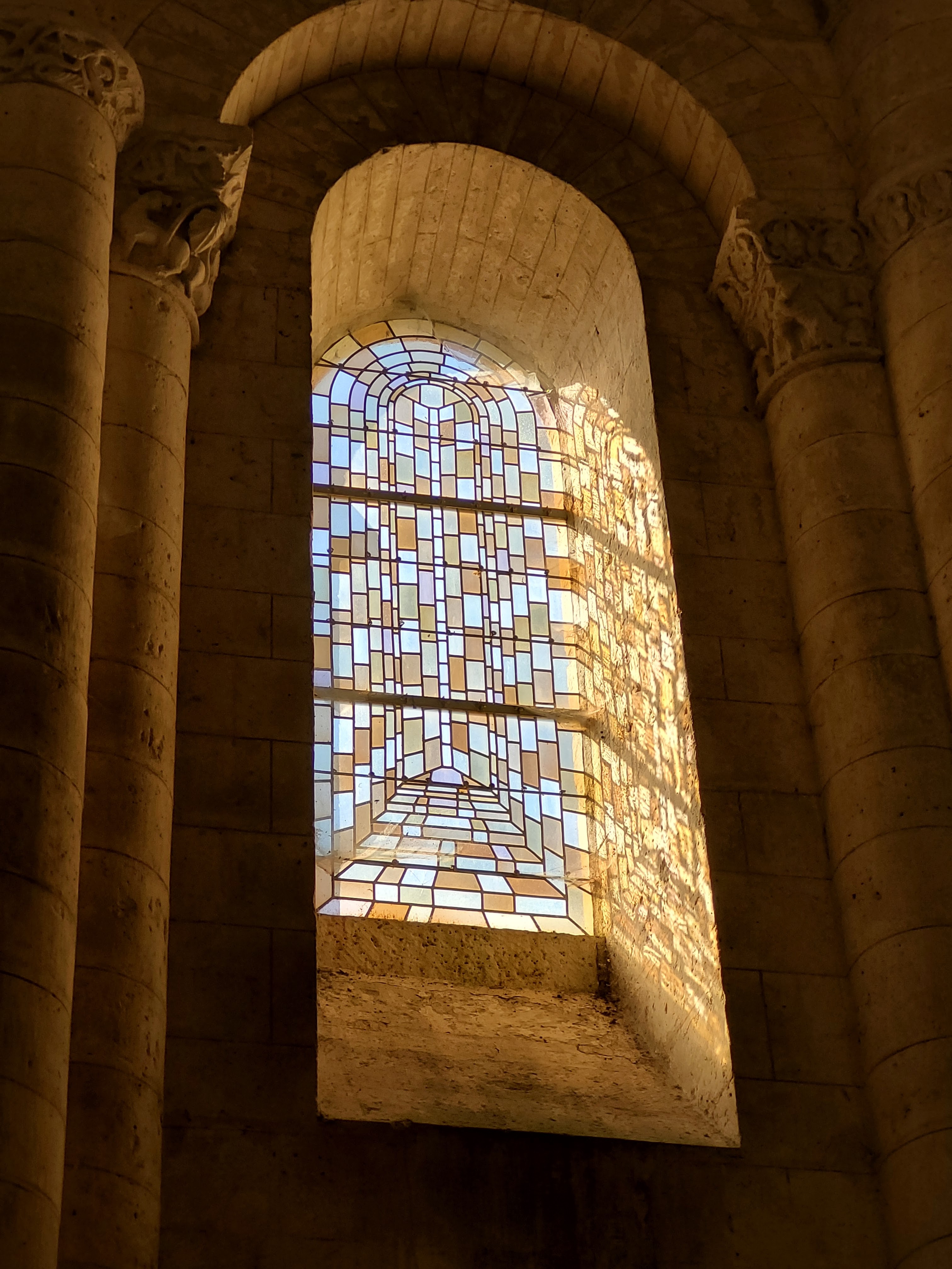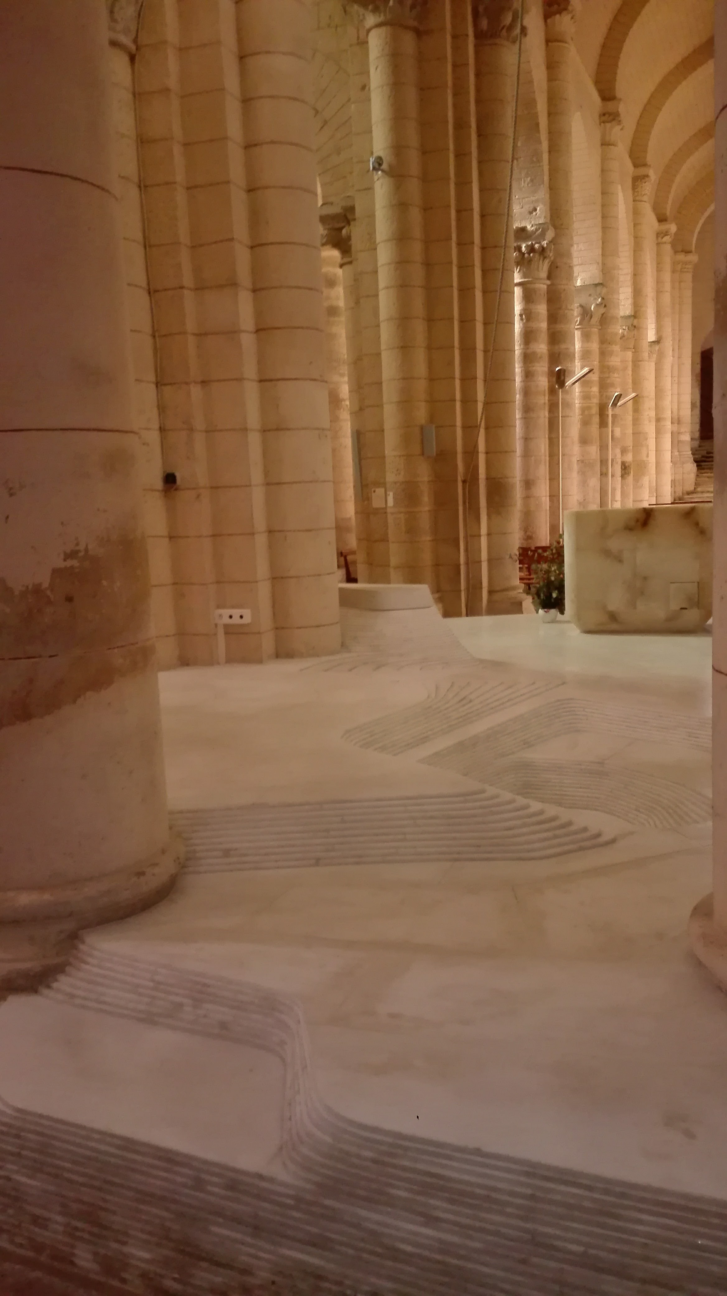 C'est une splendeur de l'art roman, posée là en bord de route. Sous un rayon de soleil elle paraît vite d'une blancheur immaculée. On doit reconnaître que l'autel de Mathieu Lehanneur s'est parfaitement intégrée dans l'ouvrage malgré les siècles qui le séparent de l’œuvre des tailleurs de pierre du 12ème siècle.