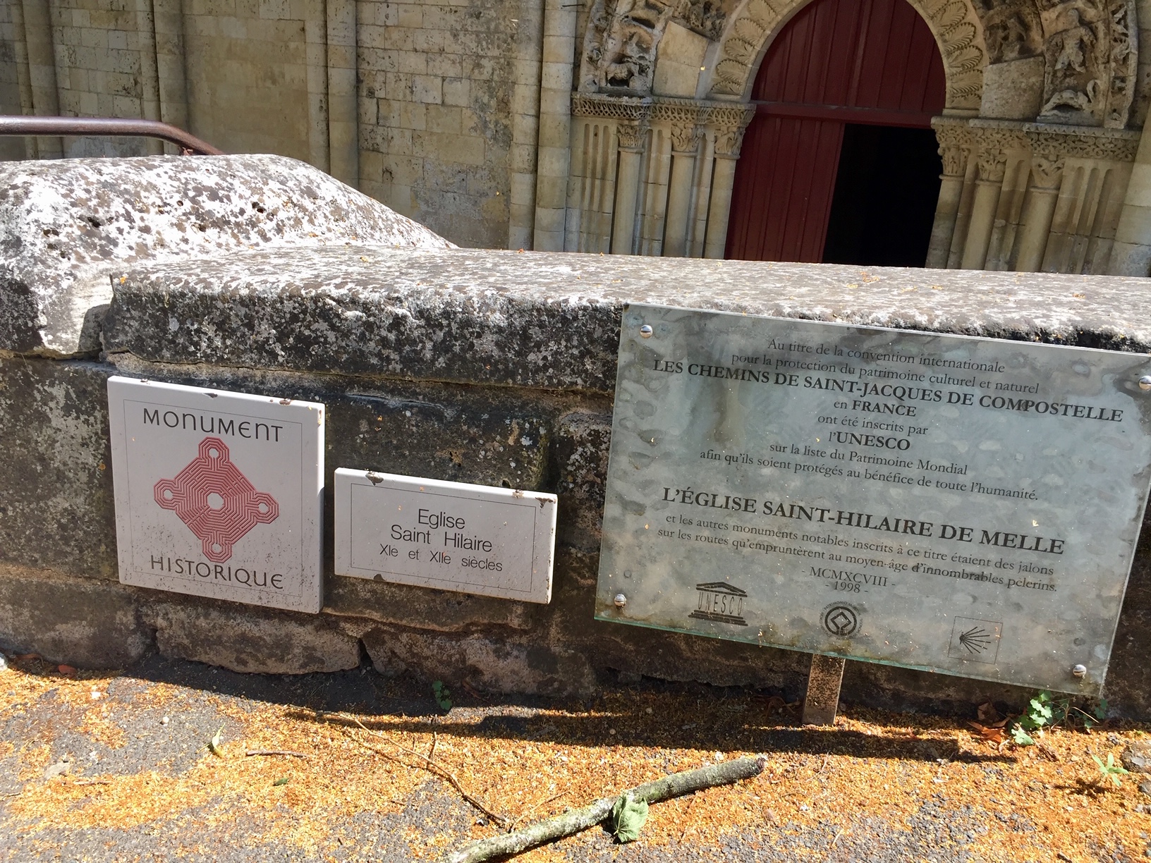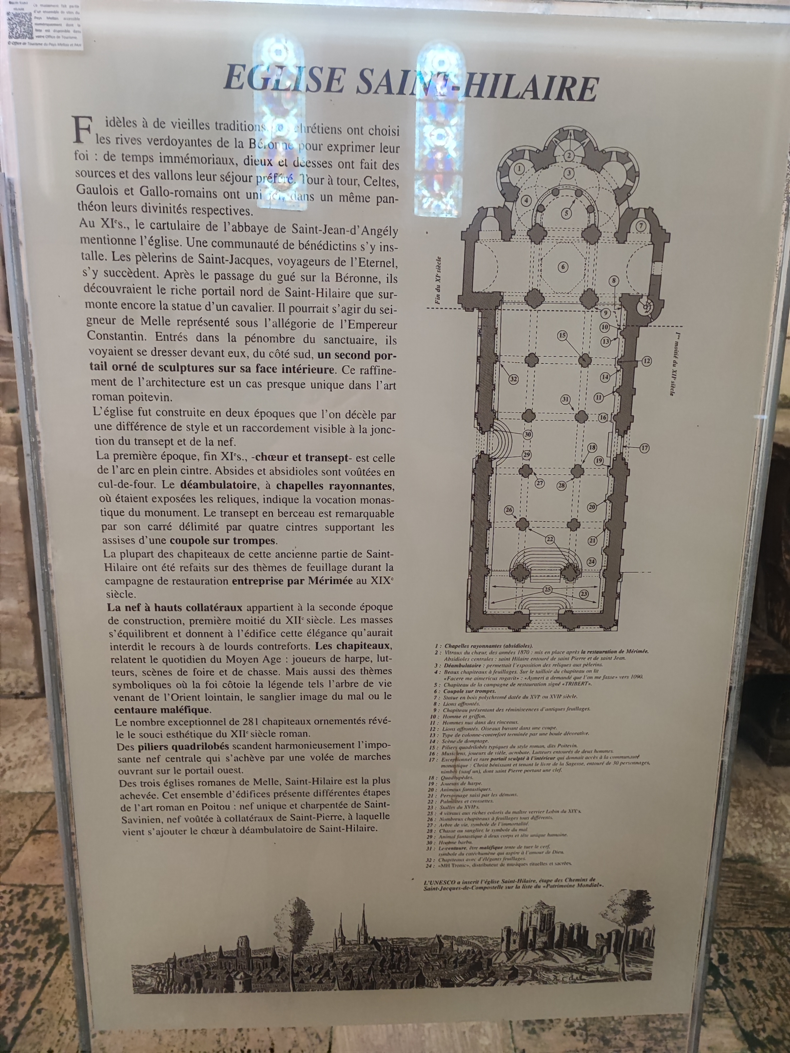 Située à Melle, charmante petite ville labellisée cité de caractère, l'église Saint Hilaire est un joyau de l'art roman.La statue équestre au dessus d'un des portails est remarquable, les modillons reprennent les thèmes classiques.A l'intérieur, le choeur et la piscine baptismale tout en marbre ,sont une véritable oeuvre d'art contemporaine , les chapiteaux historiés remarquablement conservés. Après avoir visité l'église on peut se promener dans le jardin attenant, s'asseoir sur un banc protégé du soleil par une belle treille , admirer l'ensemble et profiter d'un instant de sérénité.