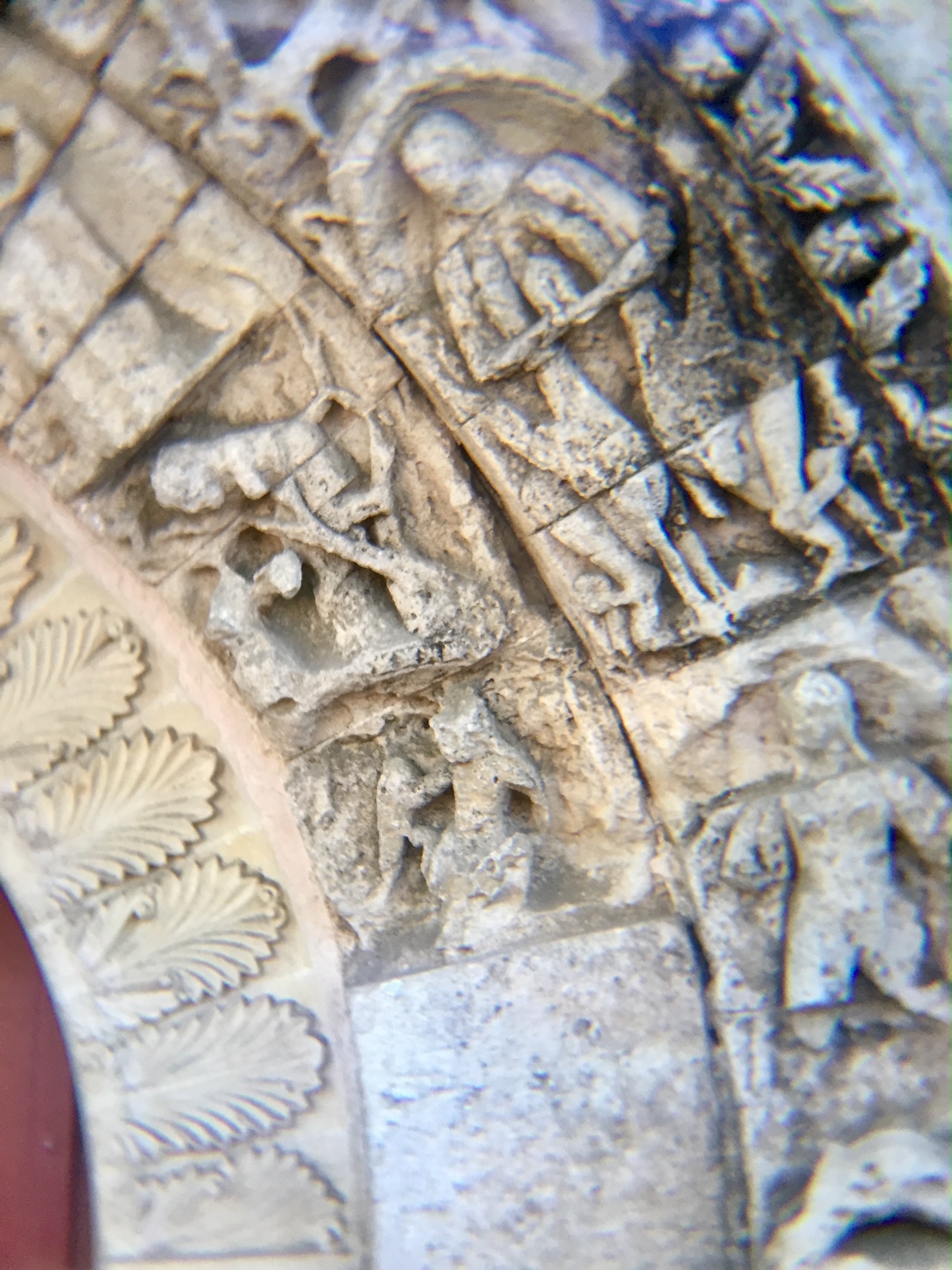 Retour vers cet édifice remarquable Des marches pour descendre vers le portail et encore des marches pour descendre dans la nef. Le chœur abrite un sanctuaire lumineux construit en marbre de Namibie (un marbre sans veine) composé de strates de 15 mm superposées réalisé entre 2002 et 2011. Un riche décor de chapiteaux sculptés à l'intérieur et à l'extérieur un programme de sculptures dense et varié. Beaucoup de ces œuvres datent de la restauration du 19ème mais certaines créations romanes originales sont encore visibles dans le déambulatoire. Un mélange d'art roman et une pointe de modernité dans le chœur rendent très séduisante cette église dont la visite comblera les curieux. Elle est de loin la plus spectaculaire des trois églises romanes de la ville de Melle. Aujourd'hui, cette église parait construite un peu en contrebas ; elle ne l'était pas au 11ème et 12ème siècles puisque le franchissement de la rivière se faisait par un gué et non par le pont qui a surélevé tous les accès.