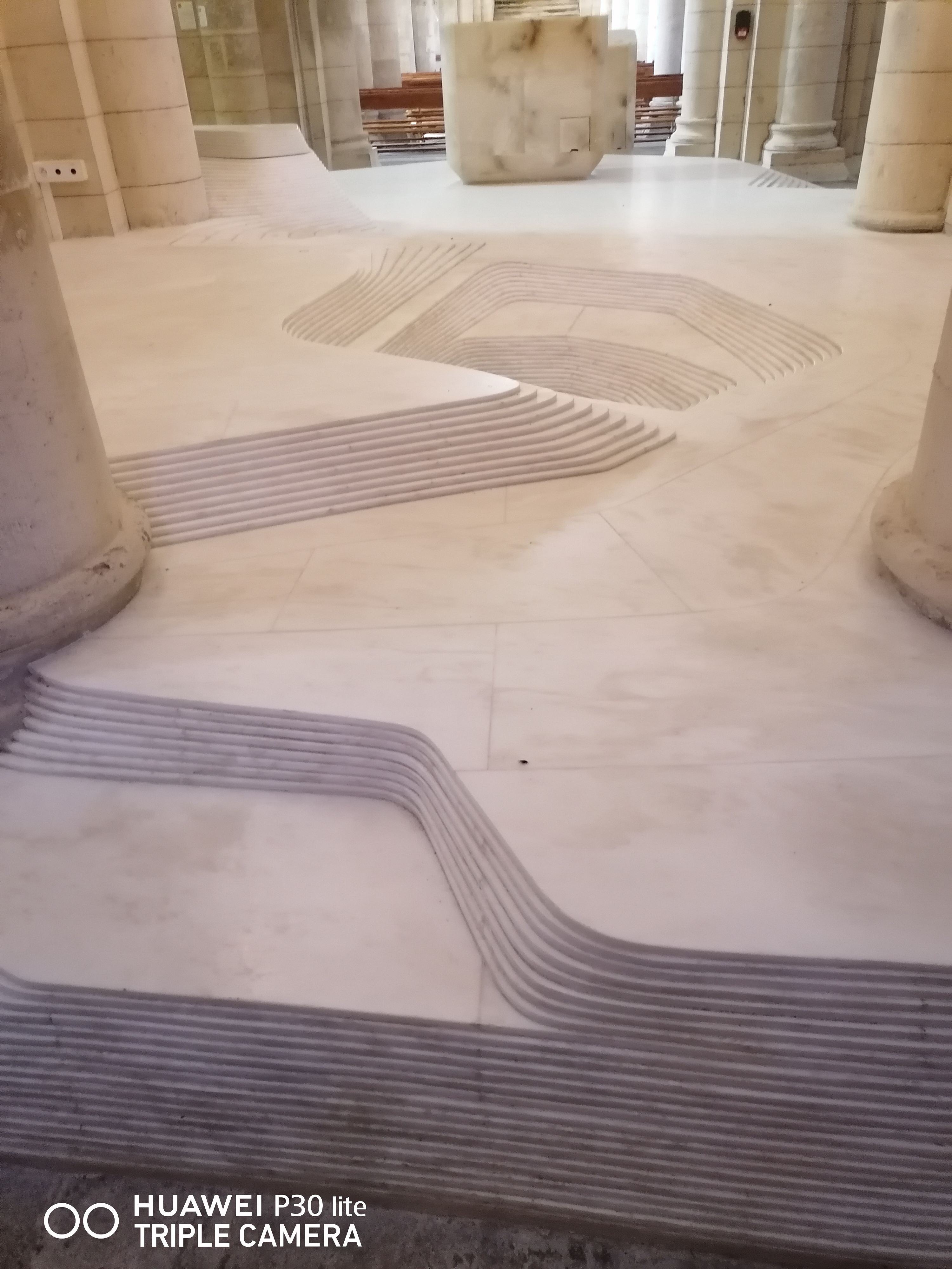 Bel intérieur, notamment le chœur, constitué de marbre stratifié. La piscine baptismale est spéciale ! Et ça dans une église catholique