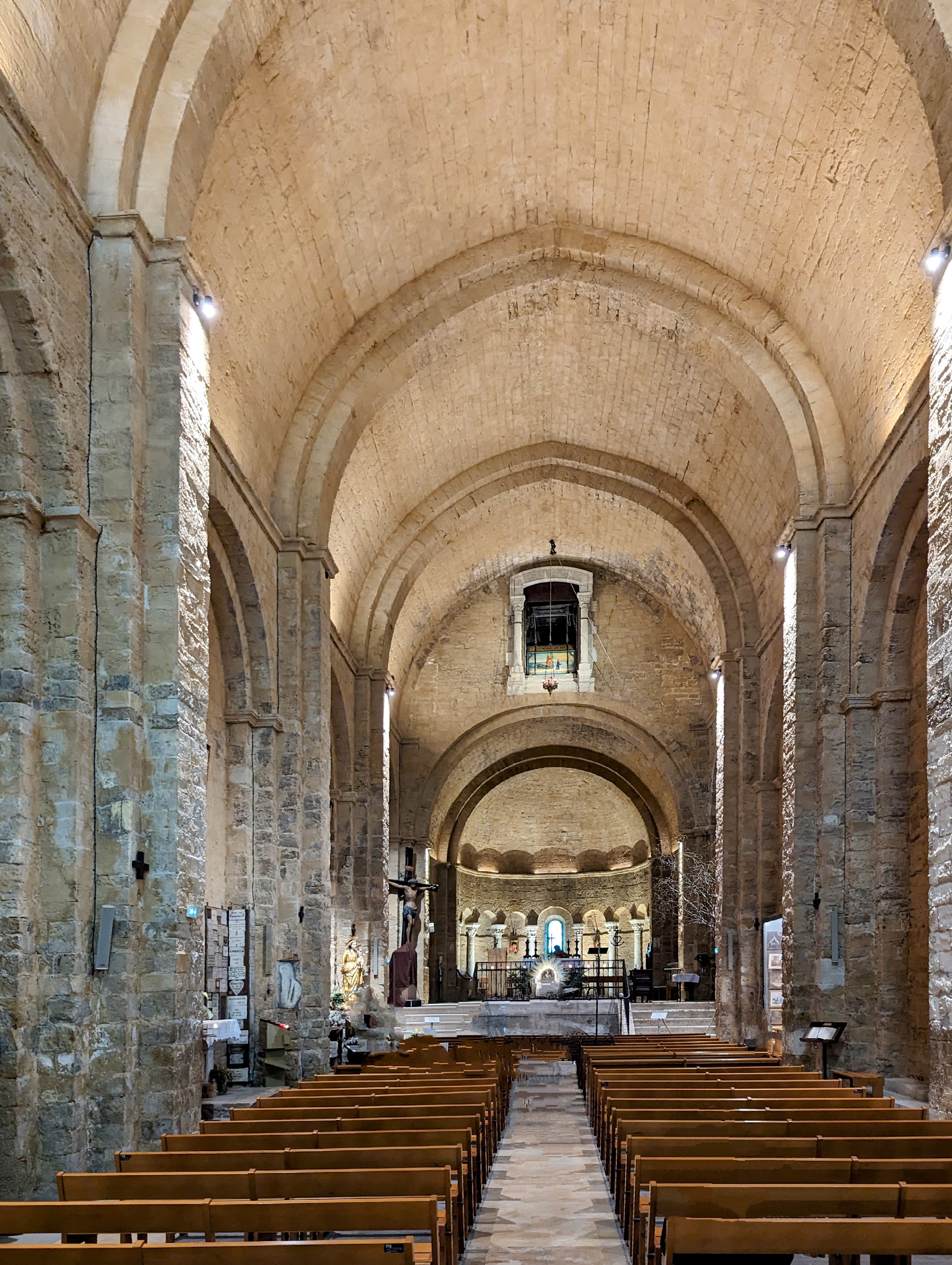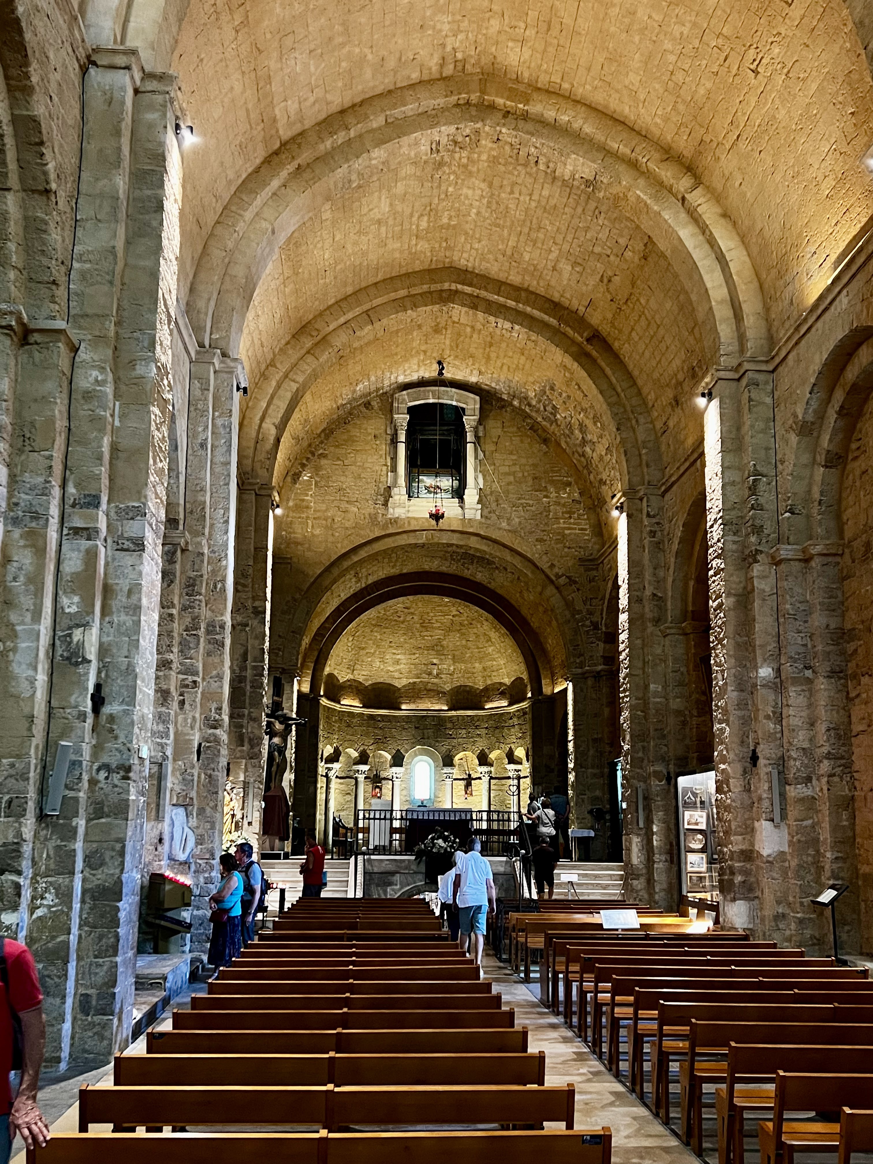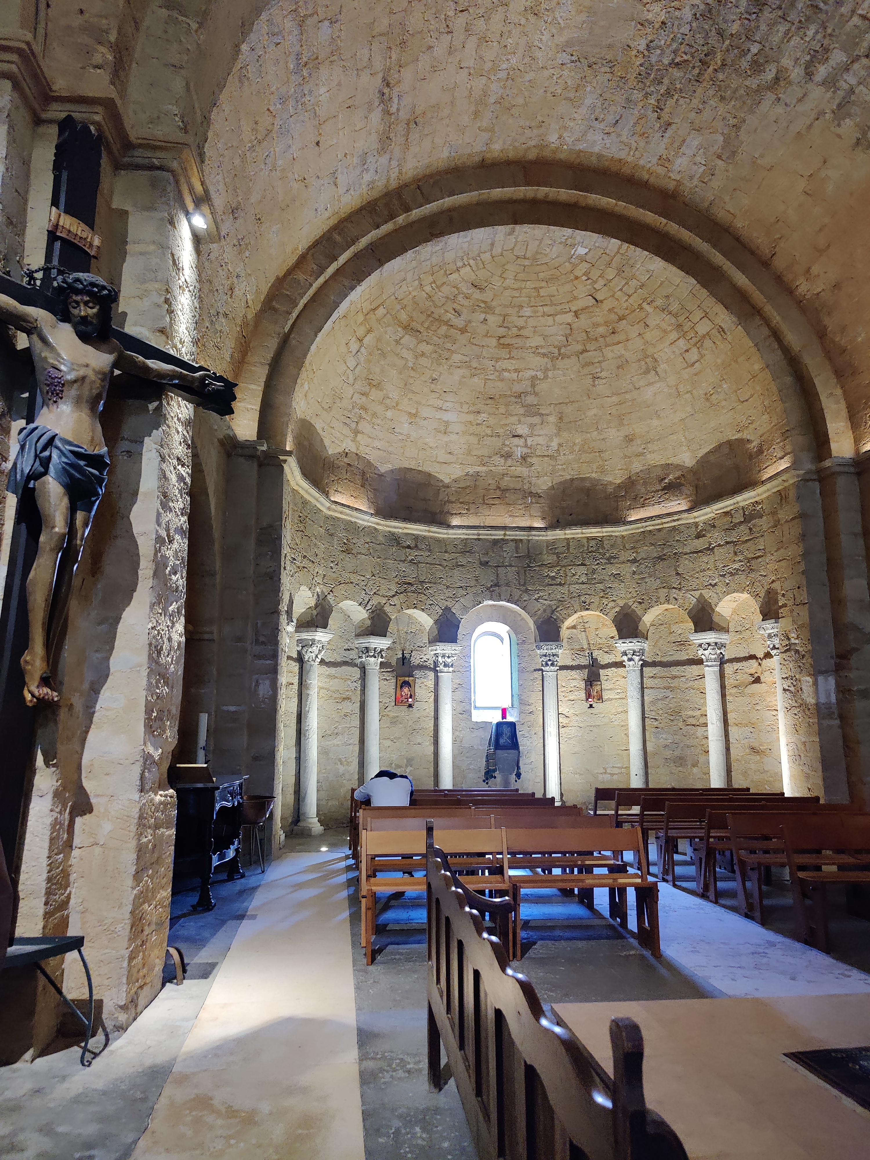 Quel bonheur de découvrir cette église après avoir visité à Arles au musée Arléon l'exposition photo consacrée au pélerinage aux Saintes Marie. Cette église est une merveille de simplicité et de douceur dans un écrin de pierre bien mis en valeur par les éclairages nocturnes. Magique !