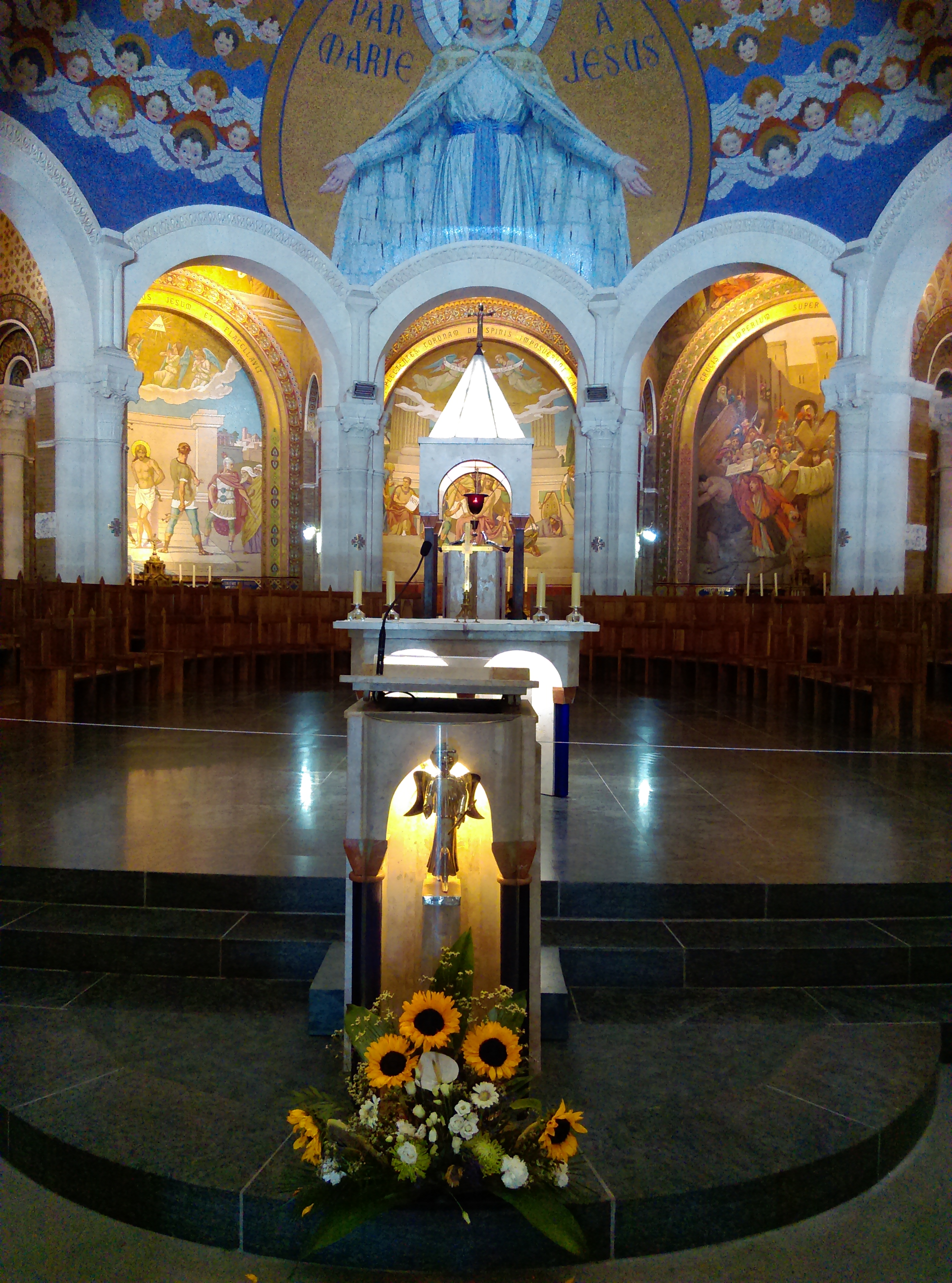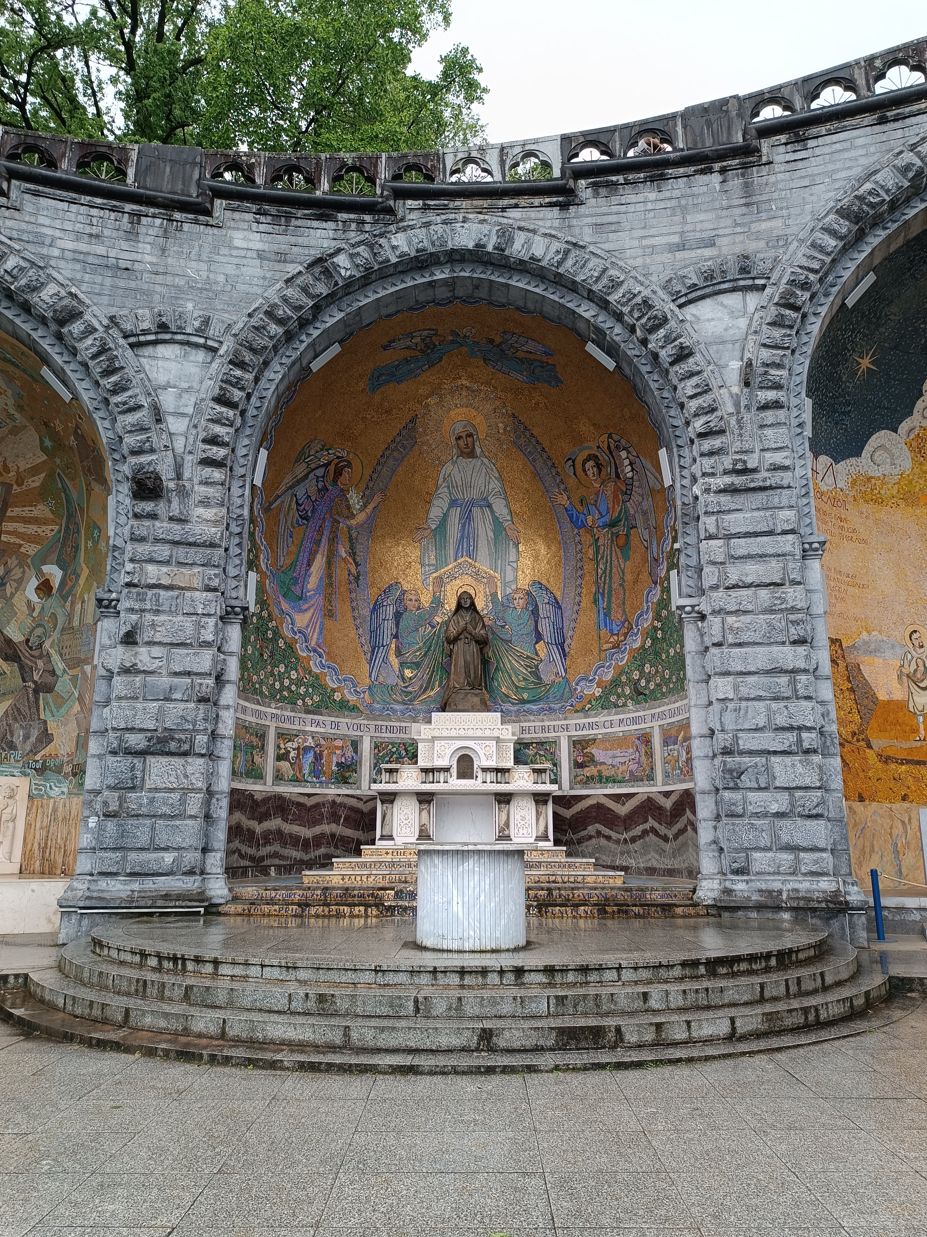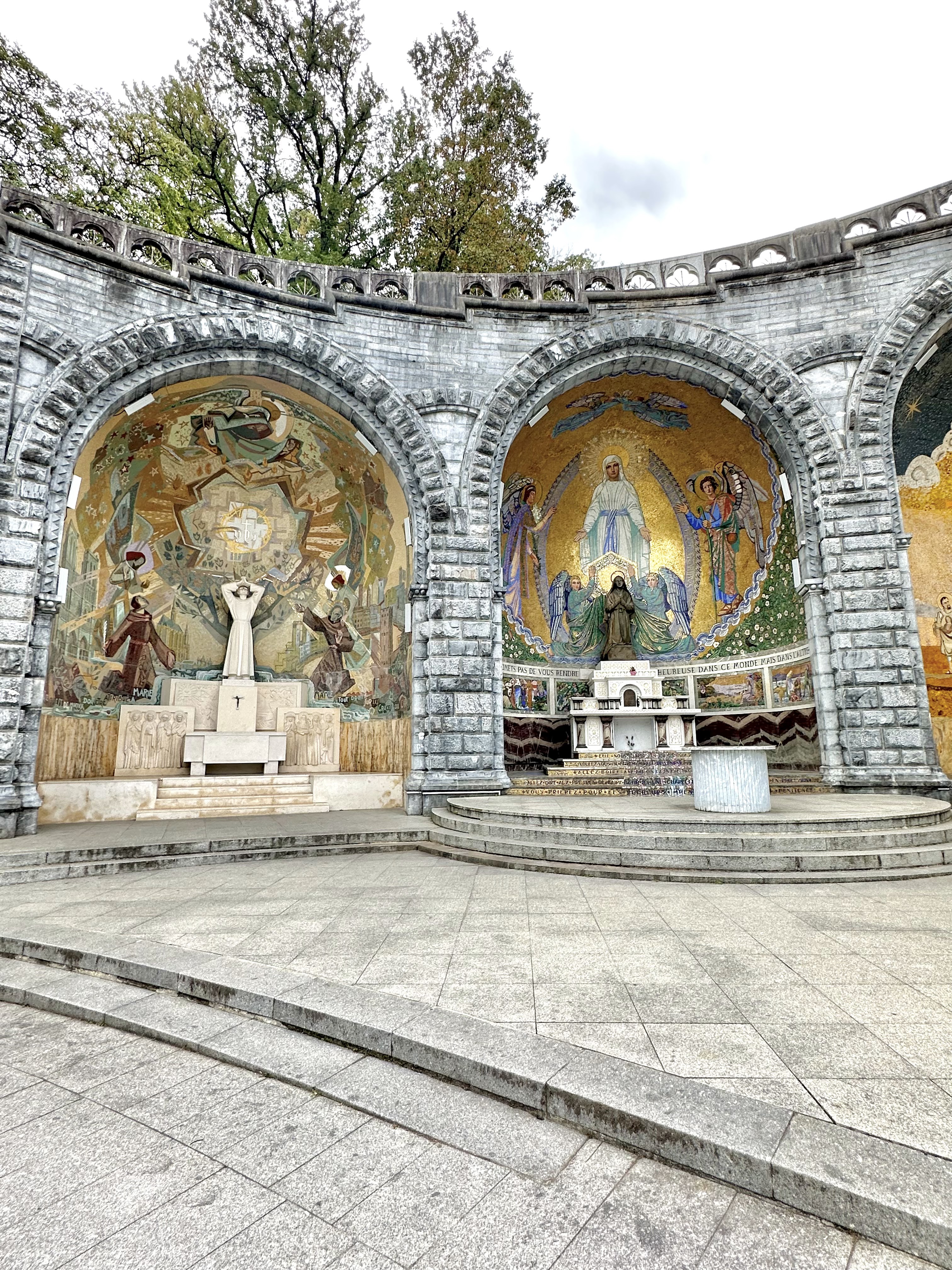 Ayant été en tant que bénévole à la Cité St Pierre pour 18 jours, j'ai été plusieurs fois au sanctuaire. Avec tous les temps (pluie, couvert et soleil) C'est un lieu apaisant c est tellement grand. Plusieurs lieux de cultes, tous différents. Il n y a que la piscine où l' on ne peut plus se tremper entièrement. Suite au COVID le rituel est différent, on vous verse de l'eau sur les mains pour les laver, puis de l'eau pour laver notre visage et on termine par boire l'eau dans nos mains.