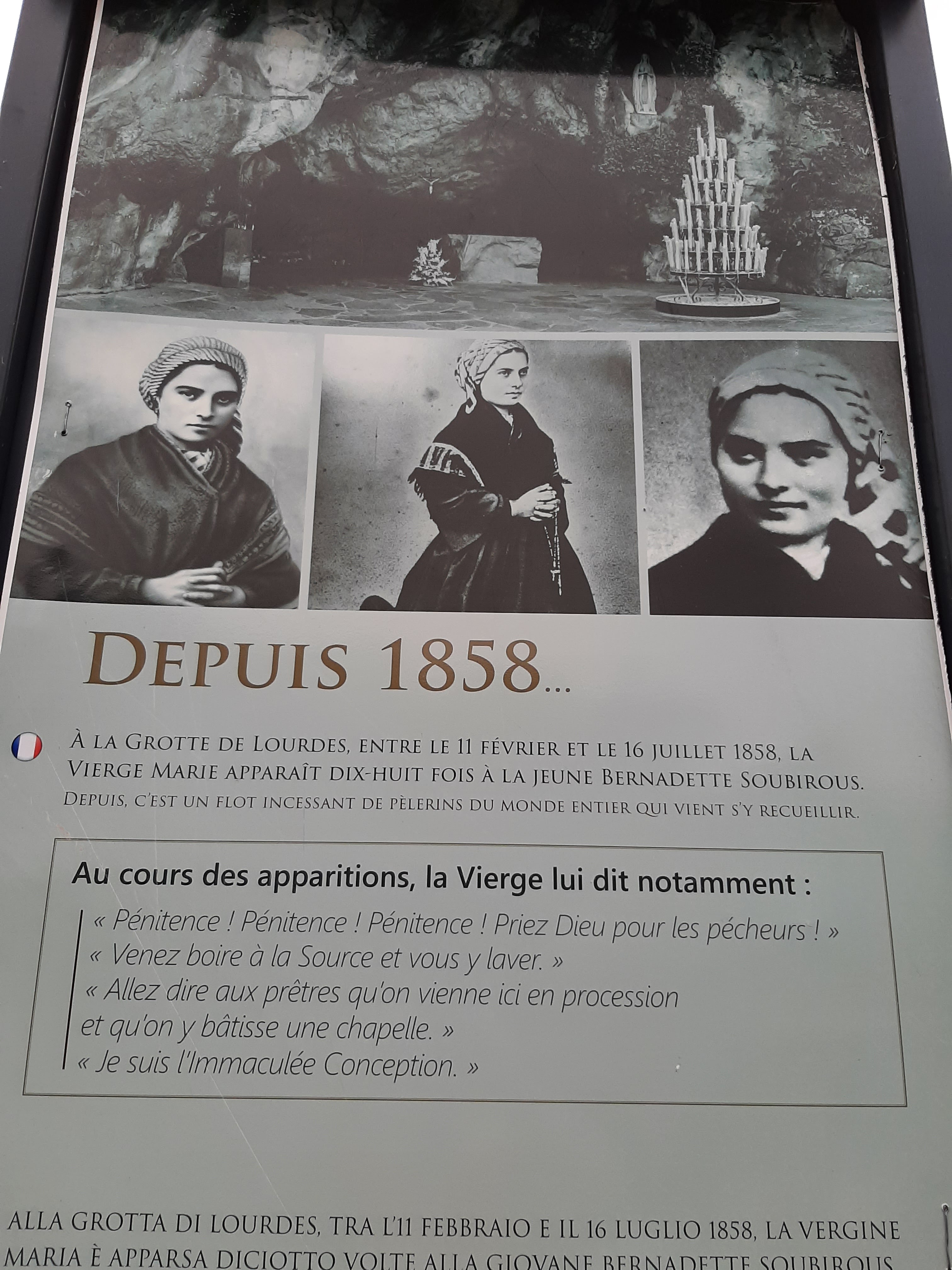 Quando visito un luogo di culto, importante come Lourdes, mi viene in mente sempre una frase: i mercanti sono rientrati nel tempio. Non so cosa mi aspettassi, forse sentire la vicinanza della Madonna, ma se c'era è stata sostituita da bottigliette di vetro a 2 euro. Quello che dirò adesso potrà essere blasfemo per qualcuno ma con tutti i soldi che guadagna il santuario, almeno il wifi gratis potevano metterlo. Anche la città non è da meno, file interminabili di alberghi, costruiti uno attaccato all'altro. Se volete comprare qualcosa allontanatevi dal centro, troverete la stessa merce a molto meno. Cuando visito un lugar de culto tan importante como Lourdes, siempre me viene a la mente una frase: los mercaderes han vuelto al templo. No sé qué esperaba, quizás sentir la cercanía de la Virgen, pero si la había, fue sustituida por botellitas de cristal a 2 euros. Lo que voy a decir ahora puede resultar blasfemo para algunos, pero con todo el dinero que gana el santuario, al menos podrían haber puesto wifi gratis. La ciudad tampoco es menos impresionante, interminables hileras de hoteles, construidos uno al lado del otro. Si quieres comprar algo, aléjate del centro, encontrarás los mismos productos por mucho menos. When I visit a place of worship as important as Lourdes, one phrase always comes to mind: the merchants have returned to the temple. I don't know what I expected, perhaps to feel the closeness of Our Lady, but if there was, it was replaced by small glass bottles at 2 euros. What I will say now may be blasphemous to some, but with all the money the shrine earns, at least they could have put in free wifi. The city is no less impressive either, endless rows of hotels, built one next to the other. If you want to buy something, move away from the centre, you will find the same goods for much less. Lorsque je visite un lieu de culte aussi important que Lourdes, une phrase me vient toujours à l'esprit : les marchands sont revenus au temple. Je ne sais pas ce que j'attendais, peut-être sentir la proximité de la Vierge, mais si elle existait, elle était remplacée par des petites bouteilles en verre à 2 euros. Ce que je vais dire maintenant sera peut-être blasphématoire pour certains, mais avec tout l'argent que le sanctuaire gagne, ils auraient au moins pu mettre le wifi gratuit. La ville n'est pas moins impressionnante : des rangées interminables d'hôtels, construits les uns à côté des autres. Si vous voulez acheter quelque chose, éloignez-vous du centre, vous trouverez les mêmes produits pour beaucoup moins cher.