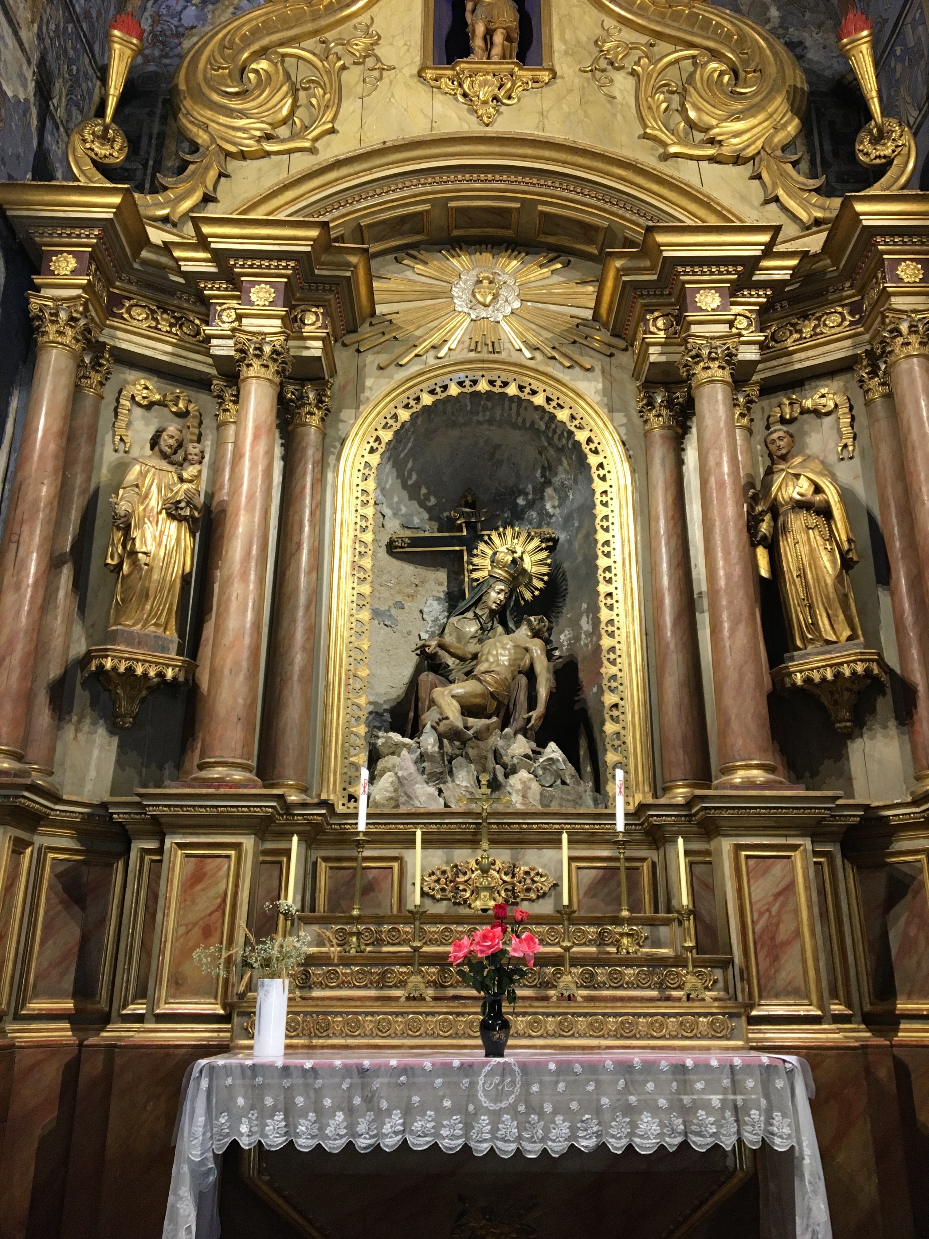 très belle église.nombreuse parties en marbre rose.magnifique retable en bois doré. superbe.