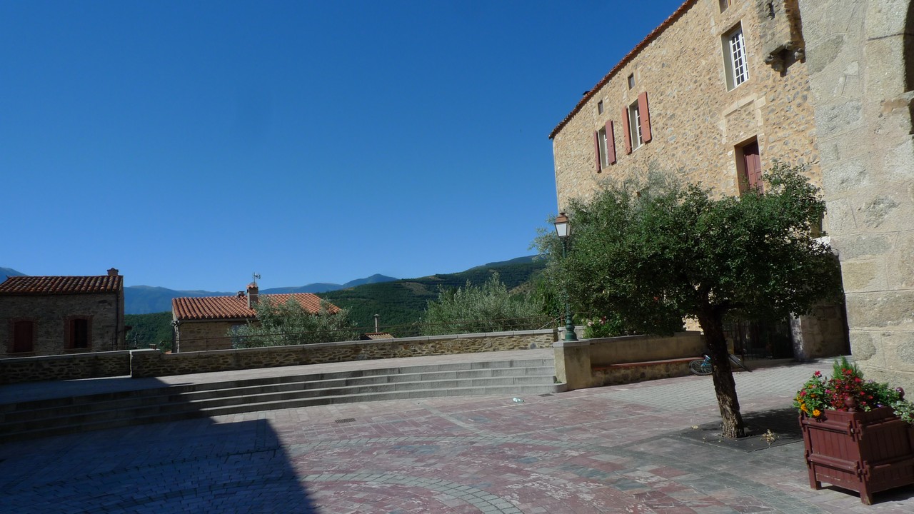 Église et la place donnant sur le Canigou