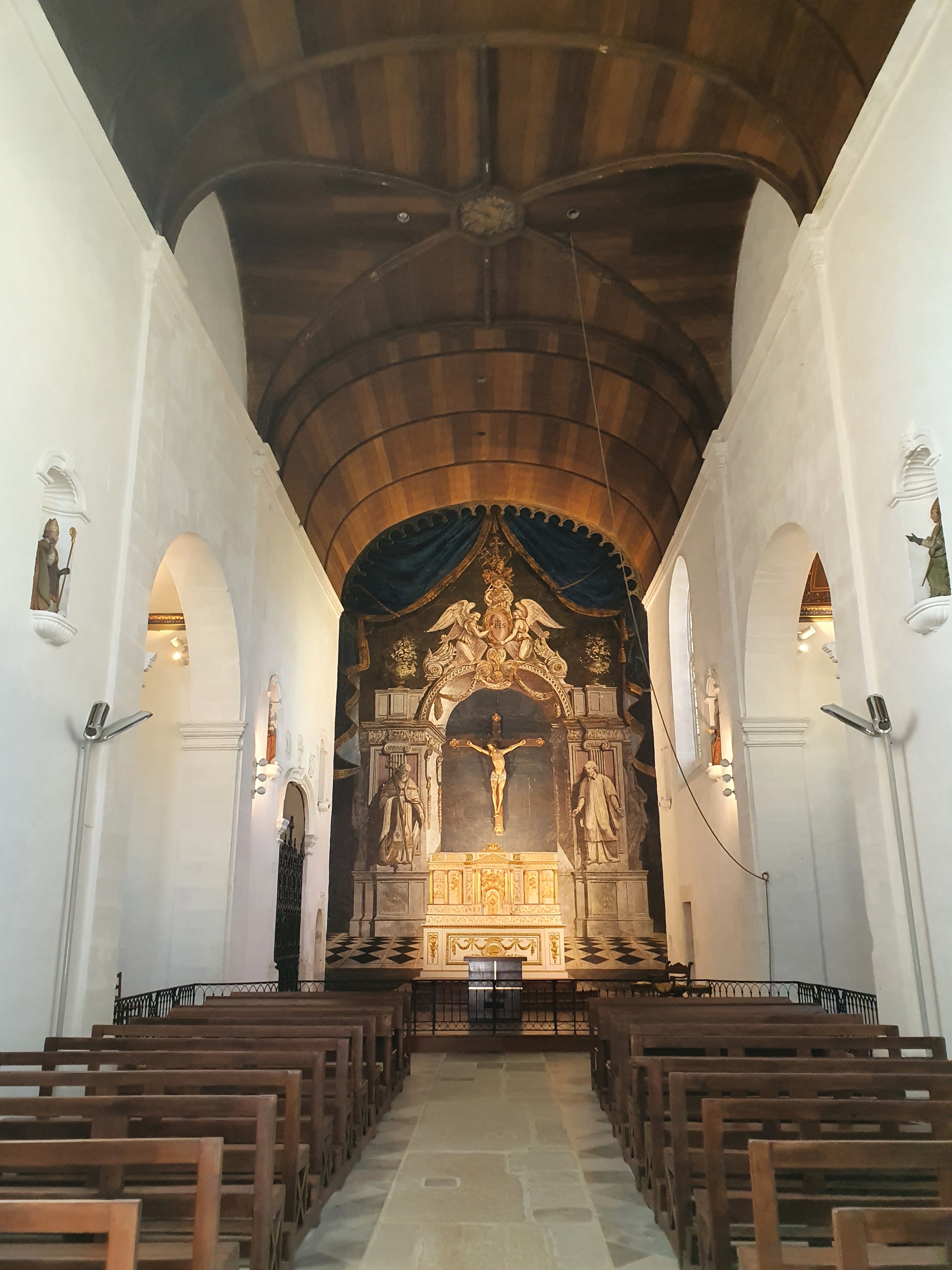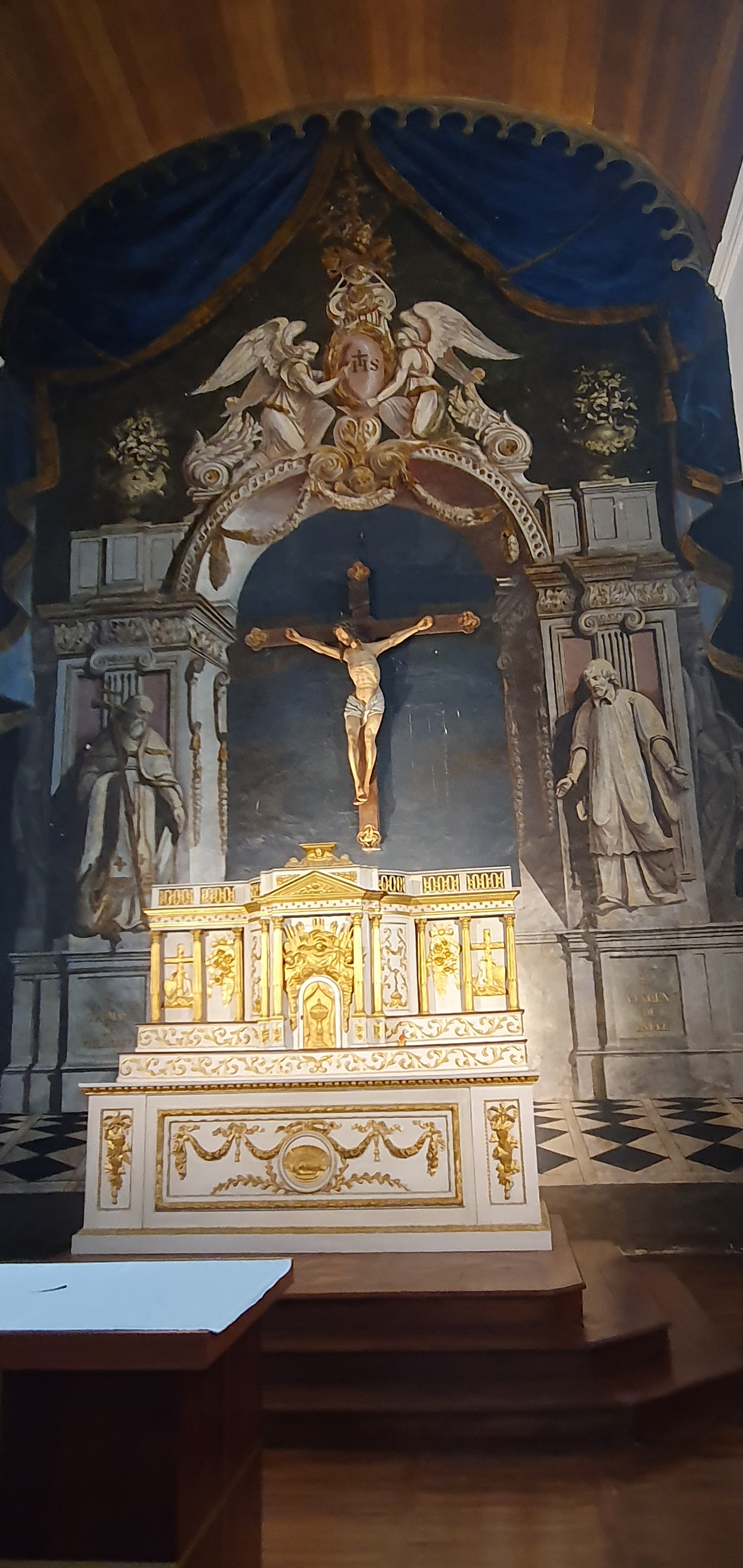 Joli plafond en bois et trompe l'oeil derrière l'autel