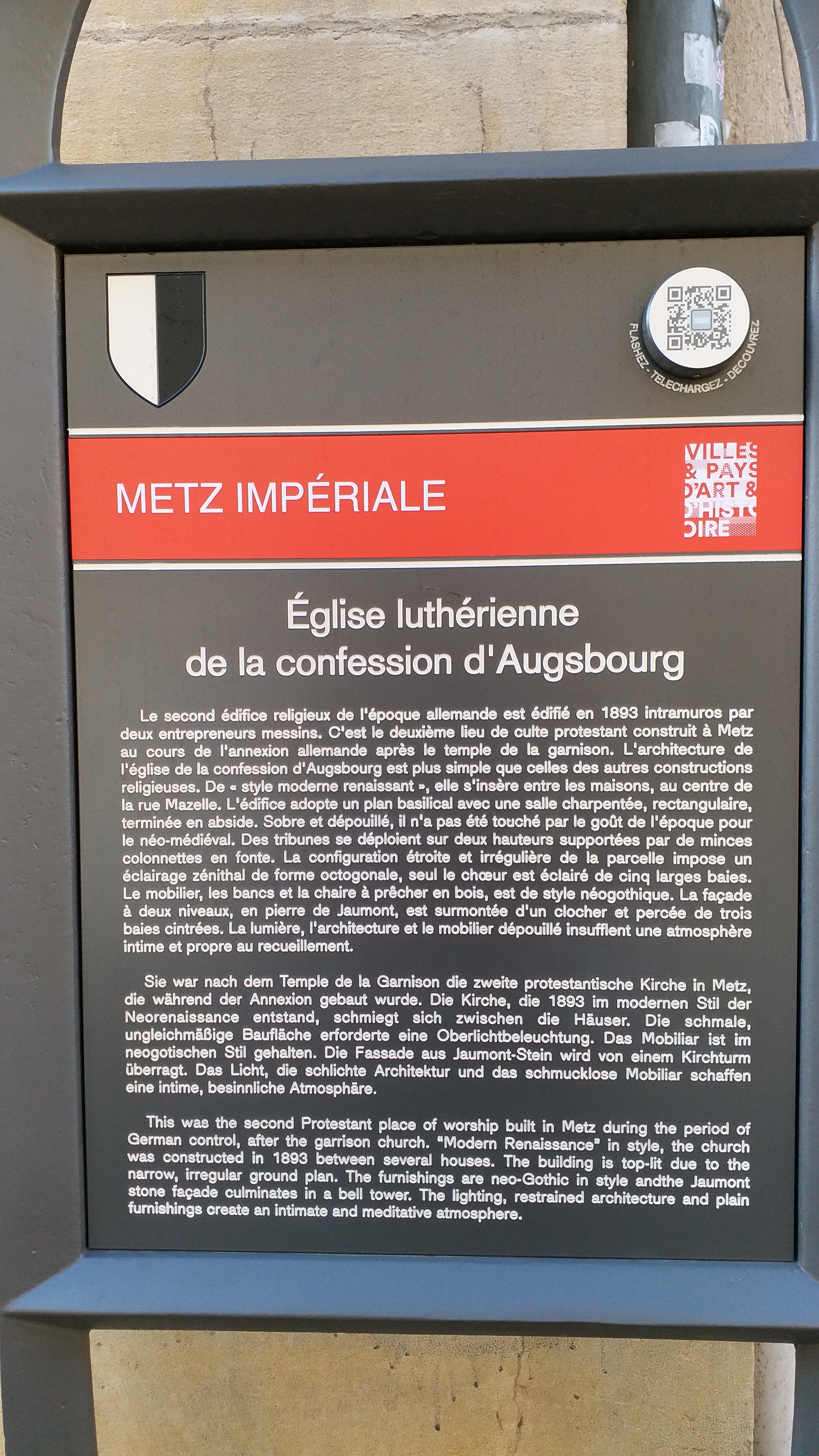 Voici toutes les informations sur le Église luthérienne Temple luthérien de Metz qui ce trouve au 41 Rue Mazelle, 57000 Metz (57). Sur cette fiche vous trouverez les photos, l'adresse, les horaires d'ouverture, le numero de téléphone et les avis clients.Vous pouvez églement rédiger un avis si vous le souhaitez en bas de page.