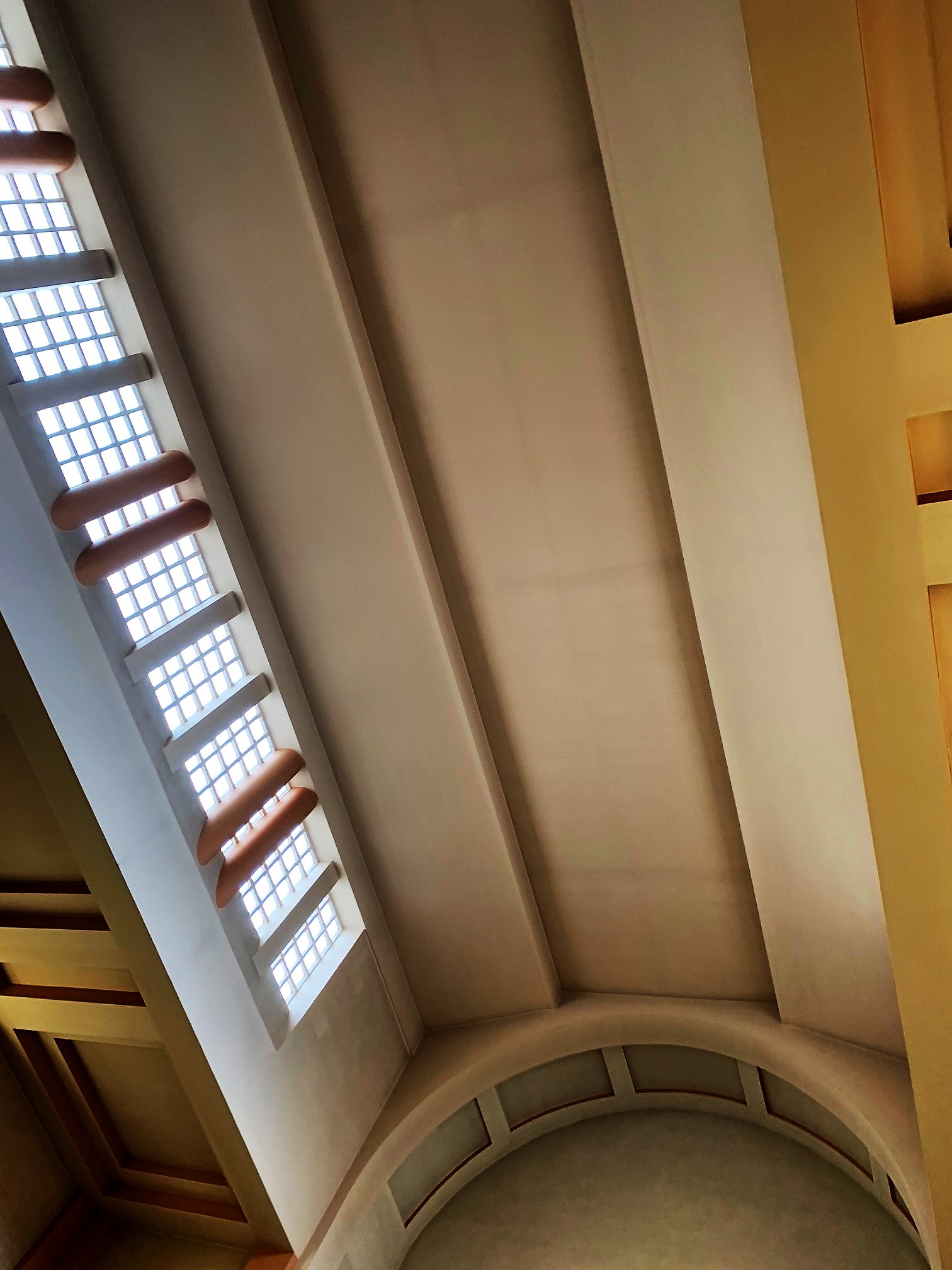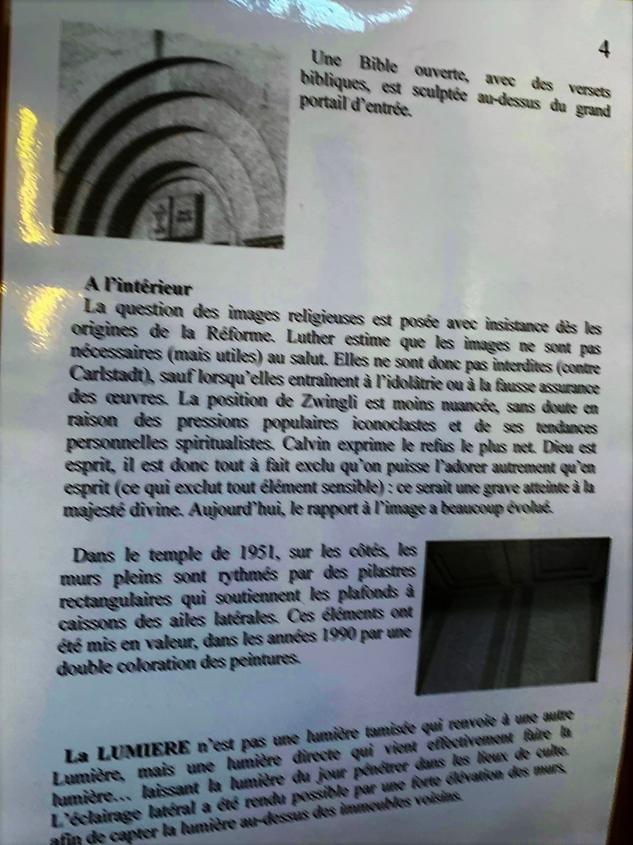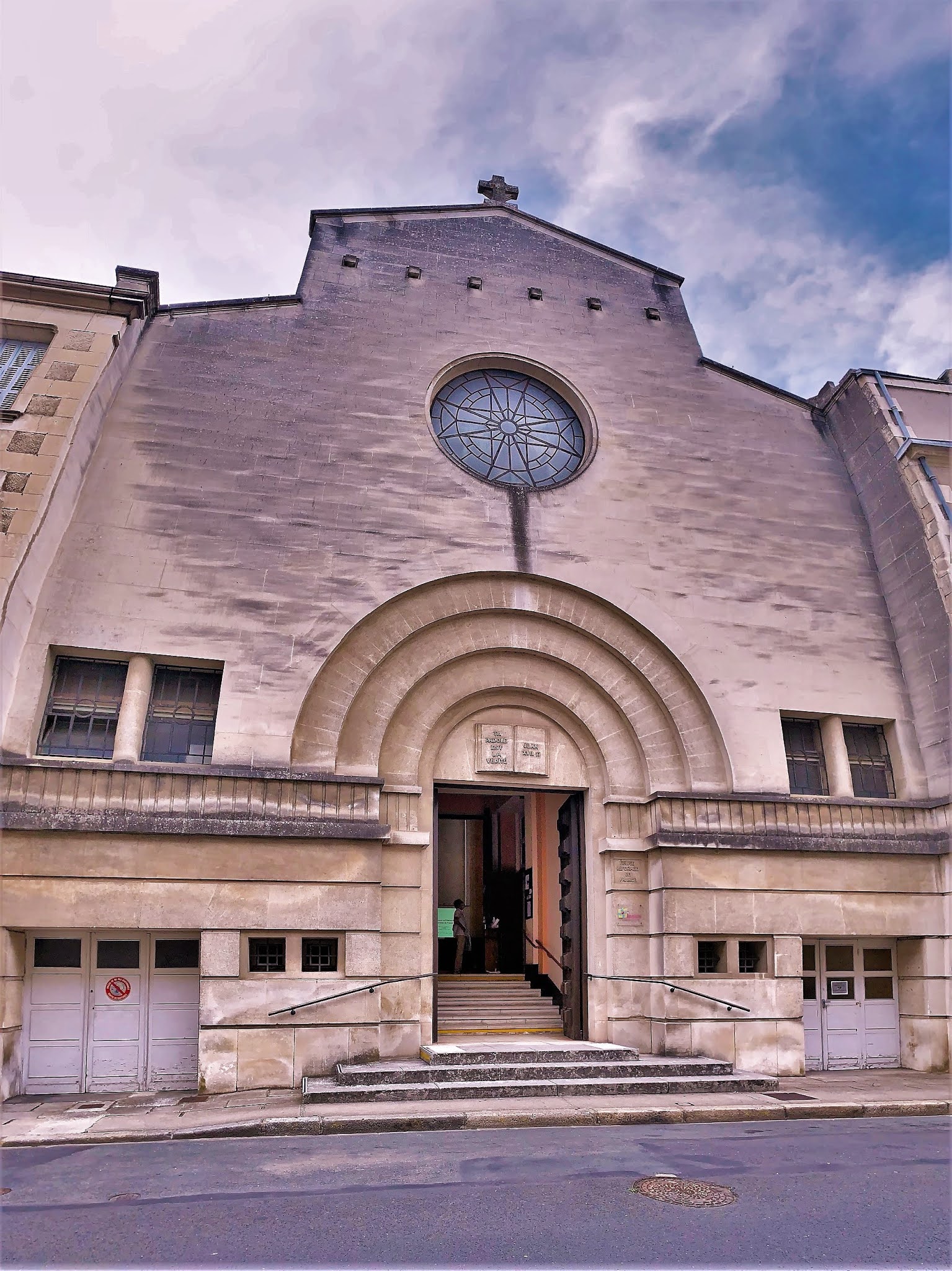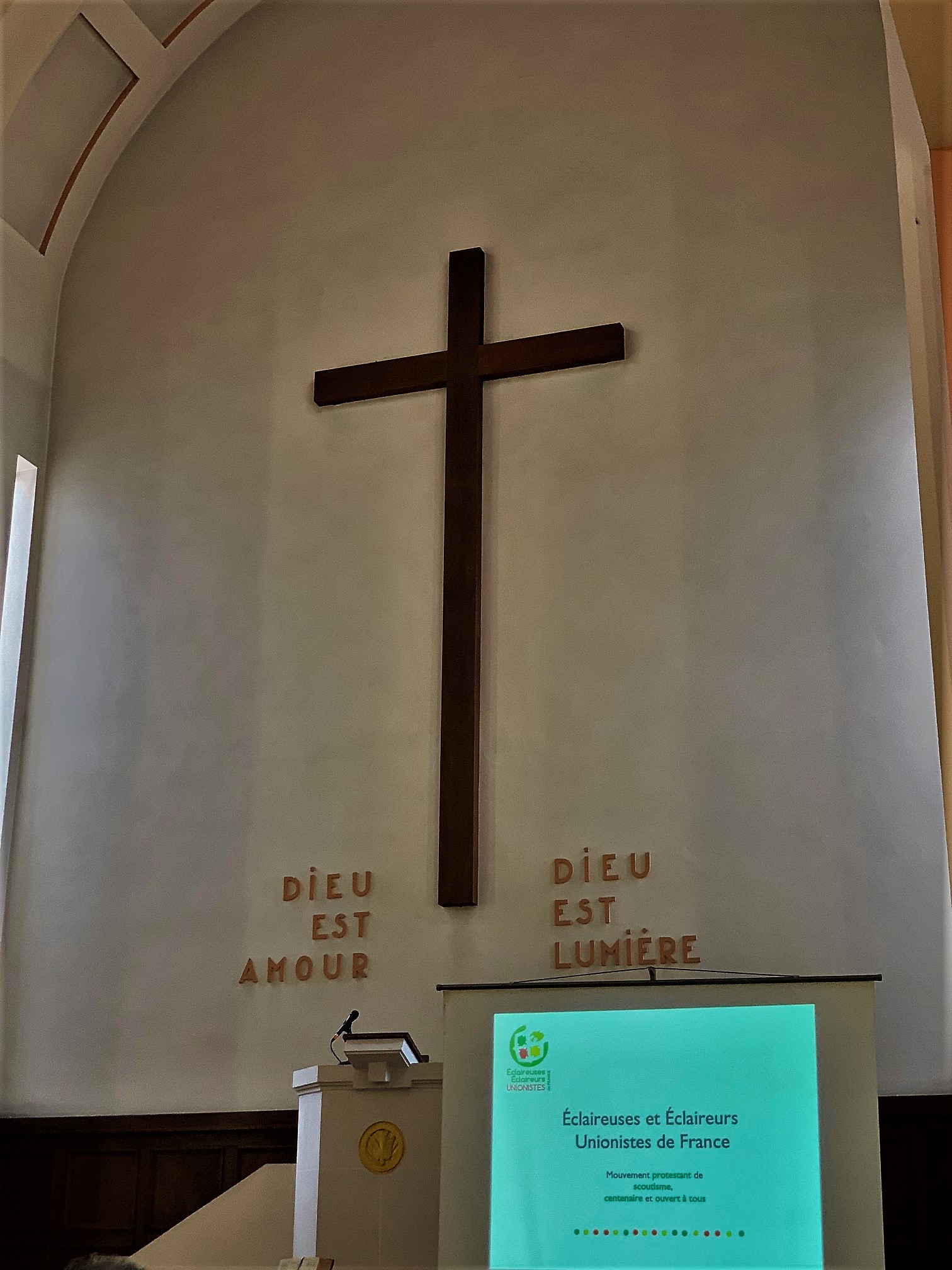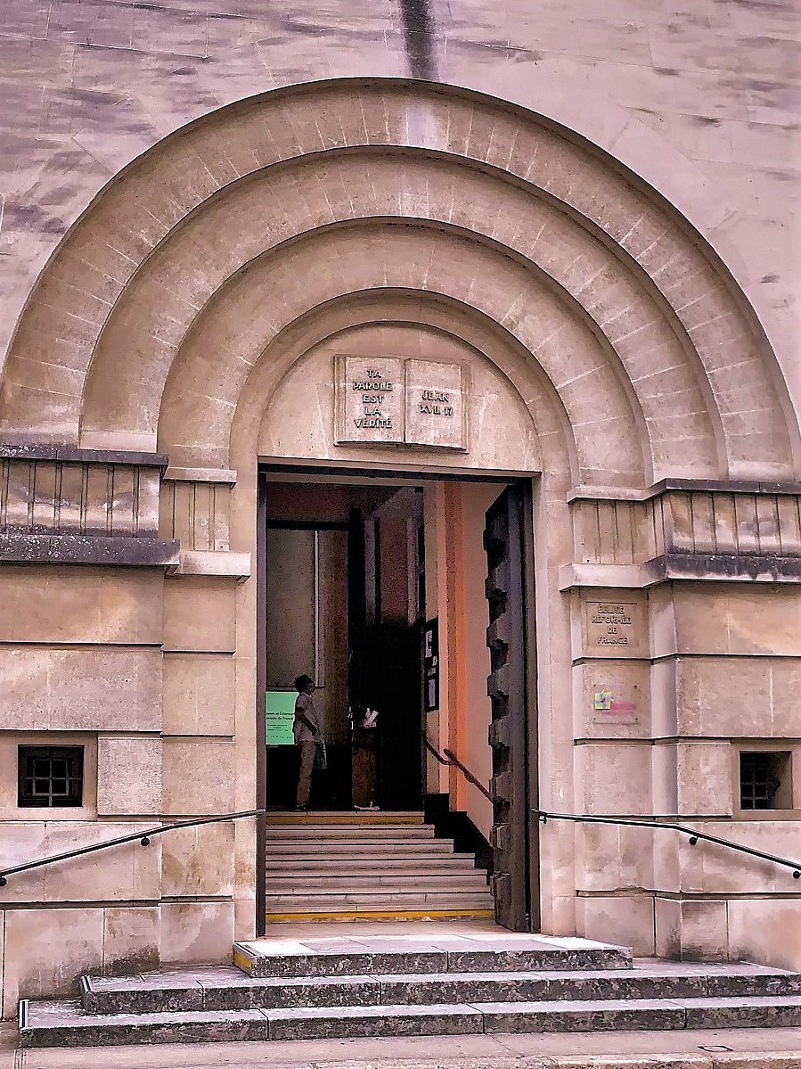 Visité à l'occasion des journées du patrimoine et d'une conférence sur le scoutisme protestant. Ce fut aussi l'occasion de découvrir l'histoire de ce temple, de ceux qui l'on précédé et du concept architectural. La signalétique est instructive. L'éclairage vient du haut par des ouvertures placées au dessus des immeubles voisins. L'acoustique est particulière, la réverbération est importante. Ce dernier point fit que les paroles de l'intervenant n'étaient pas très confortables à suivre, il fut préférable qu'il parle depuis la chaire. Si l'art et la beauté sont expressions de la foi dans les églises catholiques, l'austérité des temples protestant me laisse toujours dubitatif. Chagall et d'autres peintres, vitraillistes ou sculpteurs m'ont inspiré et permis d'avoir une vie spirituelle, pas forcément religieuse, mais riche et indispensable. Pour moi, les images ne sont pas des idoles mais des sources de joie et d'amour. Dans un tel lieu, elles me manquent.