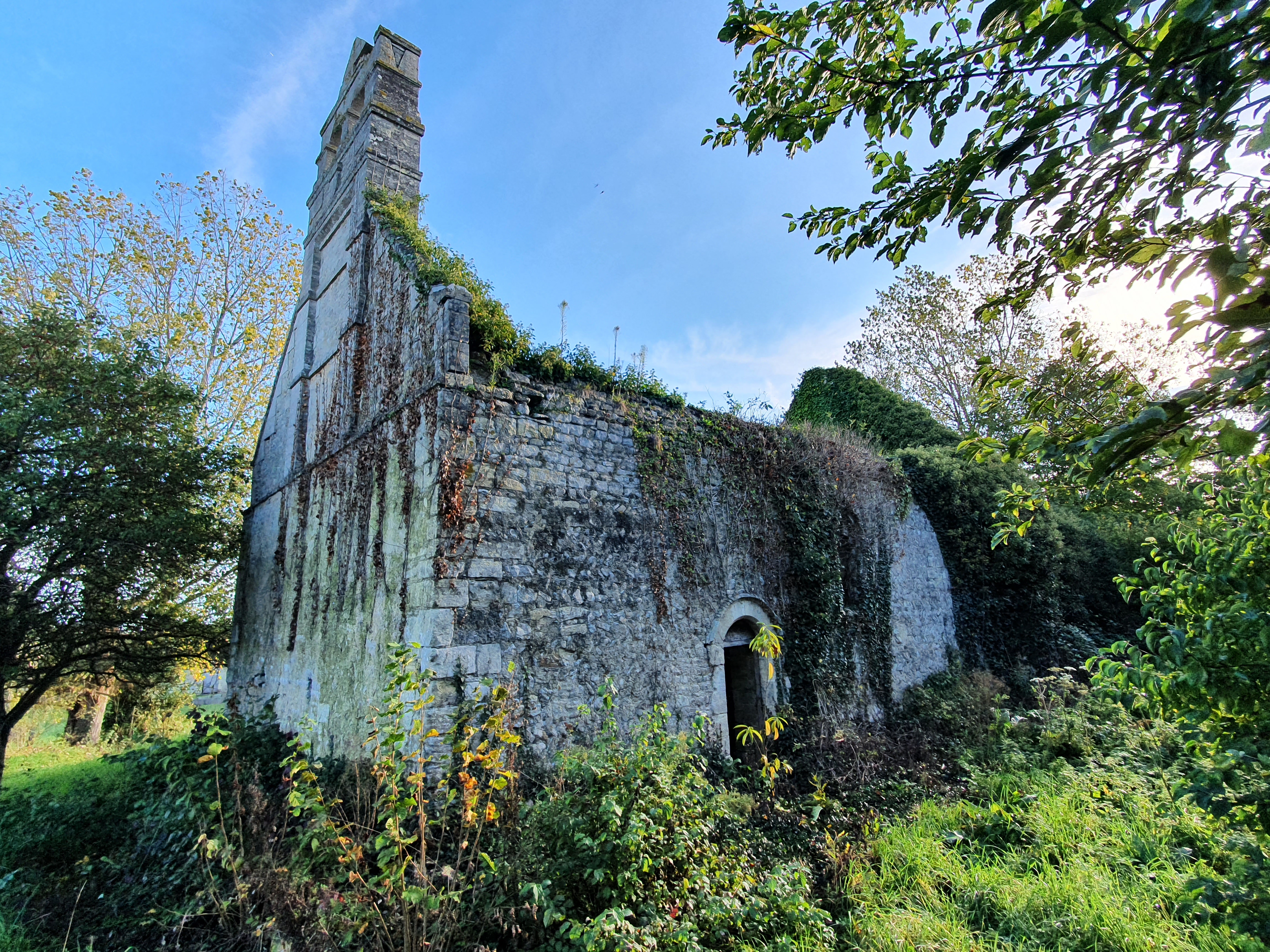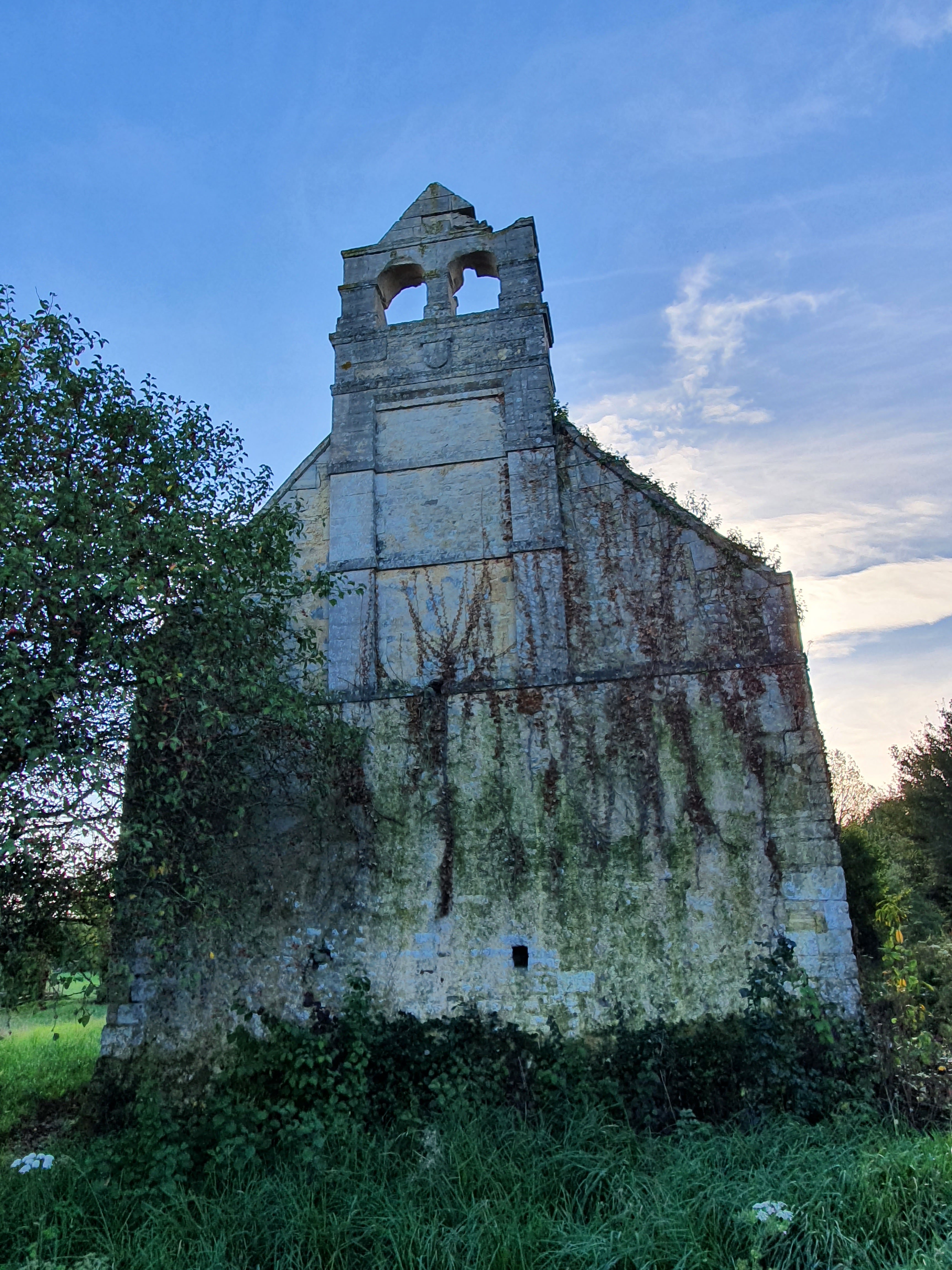 L'église Saint-Pierre (Argouges-sur-Aure) de Vaux-sur-Aure, en Normandie. Cachée dans l'enceinte d'une ferme de la taille d'un château, c'est une propriété privée ! cette belle ruine d'église est difficile à atteindre mais vaut la peine de grimper à travers les buissons épineux et autres plantes collantes. Il est entièrement recouvert de buissons et de plantes.