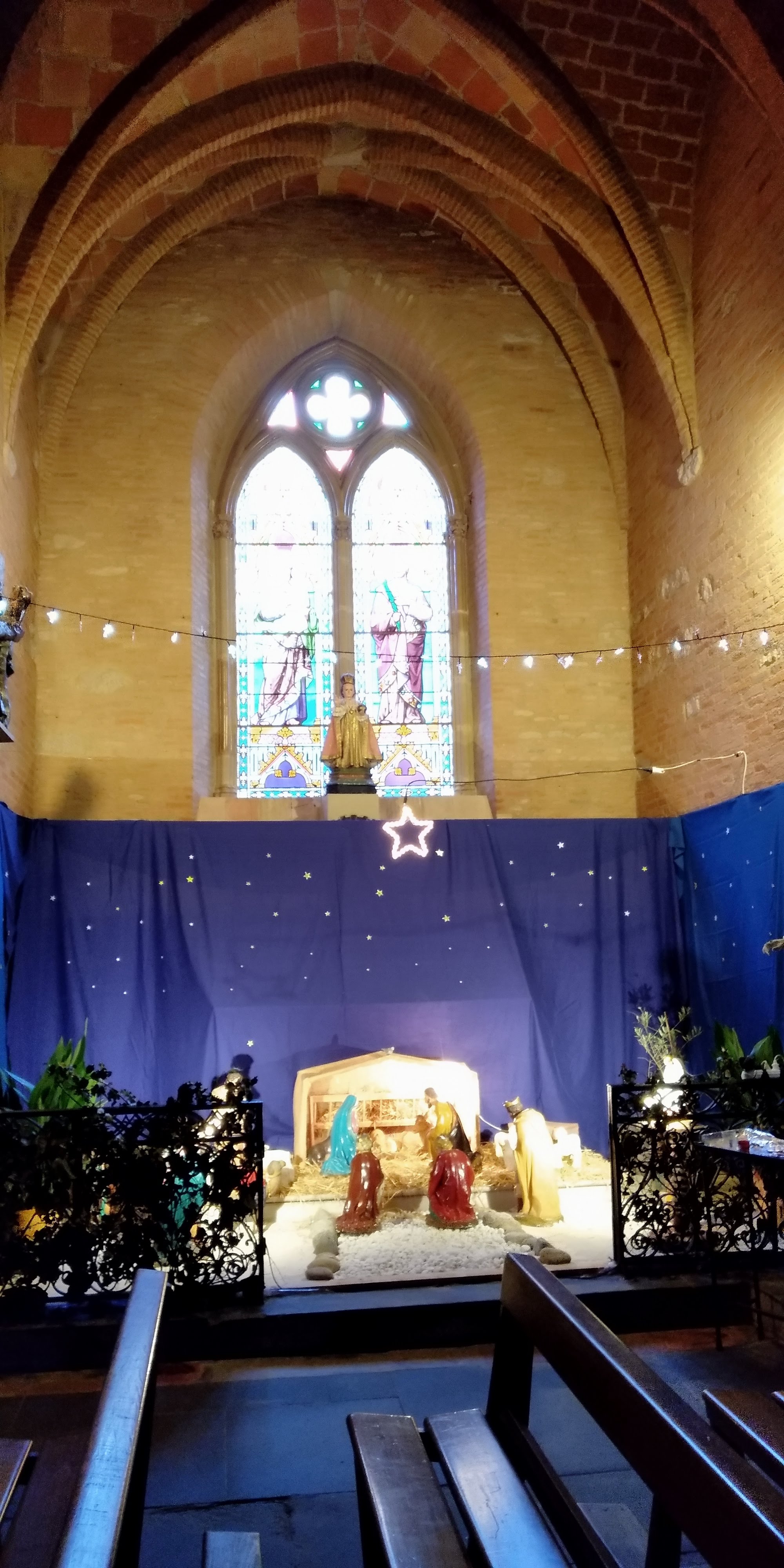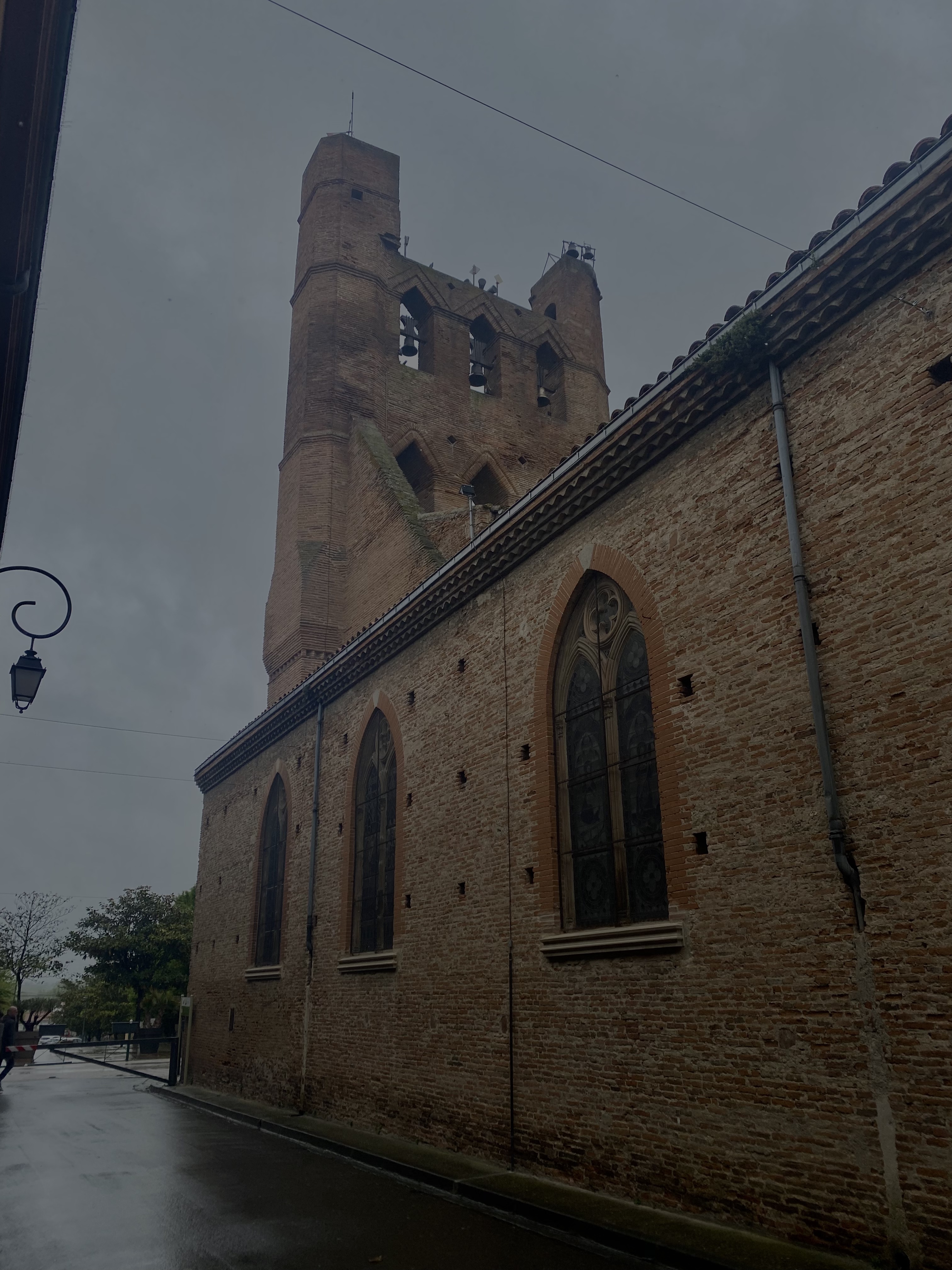 Toute en briques Toulousaines. Le chemin de croix est moderne. Il y a une chorale dynamique pour les messes du dimanche matin, 11h.